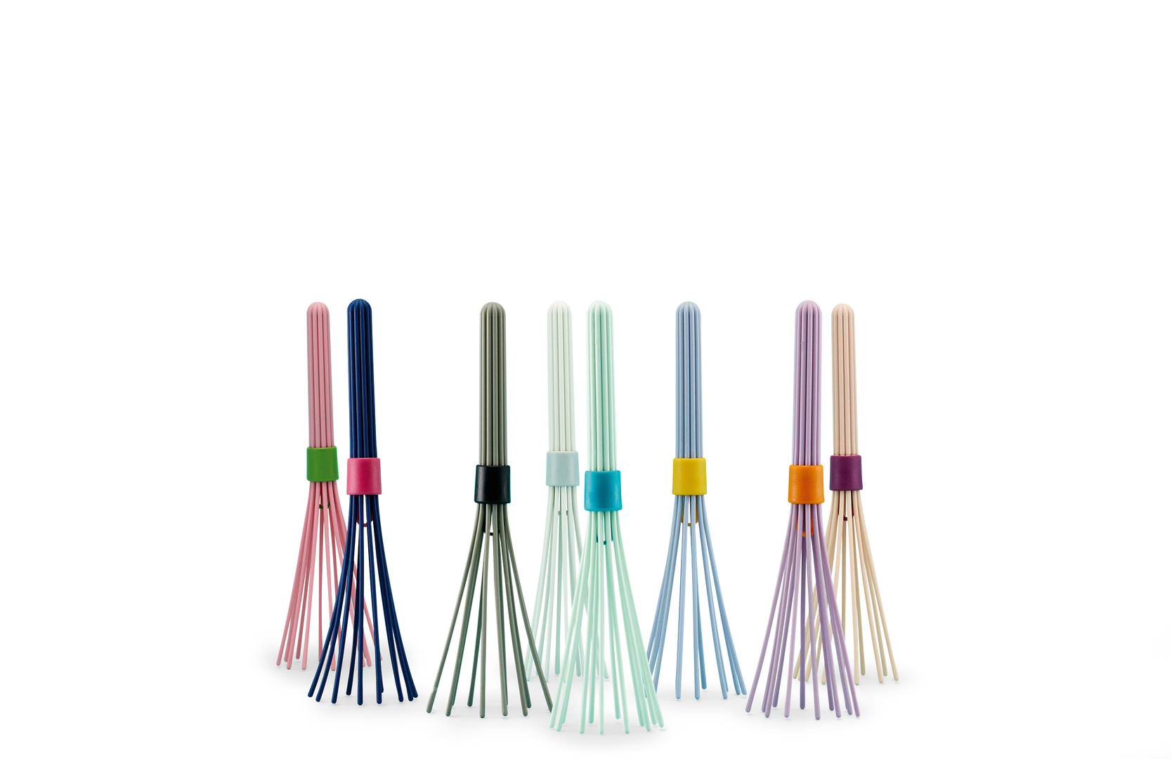The design of the Beater whisk was inspired by a straw bundle. The fastening ring in the middle serves not only as opening and closing mechanism, but also as hanger. The kitchen aid can be folded together and therefore takes up little space in the kitchen drawer or on the wall. The whisk is made of nylon and is available in eight attractive colour combinations.