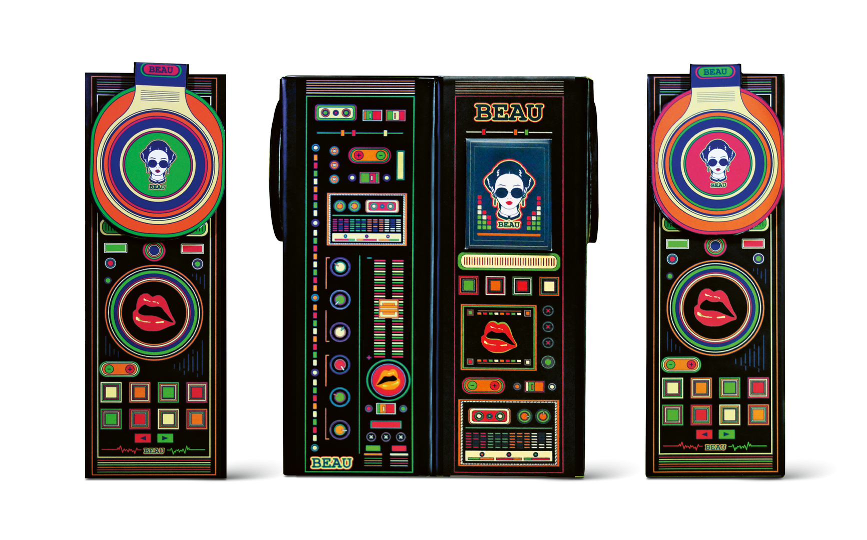 The design of the gift set for BEAU lipsticks in Contemporary Oriental Style constitutes a nuanced visual amalgamation of East and West. On the one hand, it uses style elements associated with Western nightclubs, such as neon lights and headphones. On the other, it reflects the classic image of an Oriental woman with a bun and a fan. This premium packaging comprises a carton with outer packaging which can be folded out to the side to create a fan. The high-quality box is held together using a banderole that looks like a pair of headphones.
