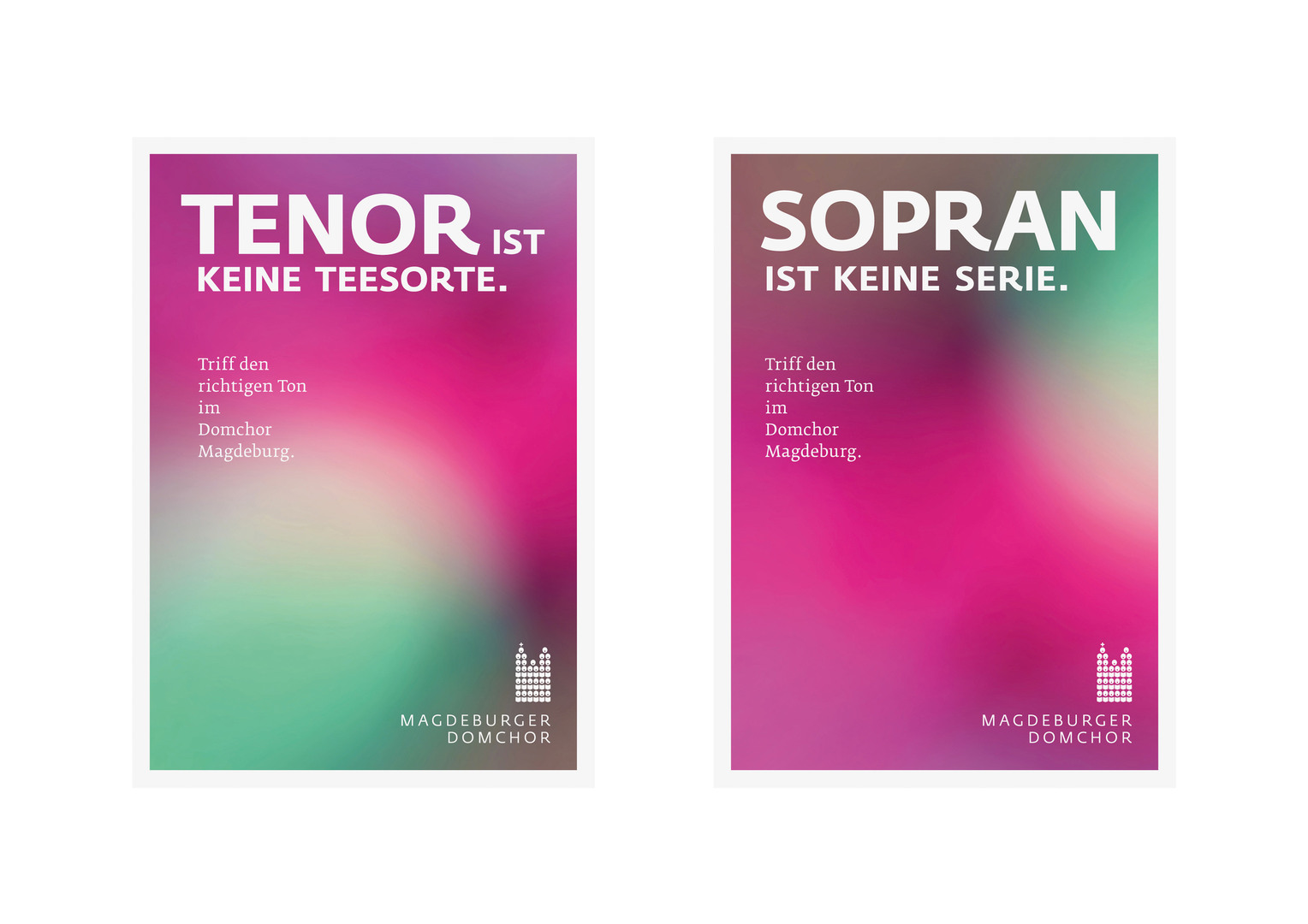 This branding for the prestigious cathedral choir in Magdeburg, Germany, presents the choir as open, cheerful and appealing to a wider audience. The aim was to show presence, draw attention and, last but not least, to attract new members. The concept was realised through the use of sacred yet fresh colours, as well as a logo that presents the choir with a “twinkle in the eye” and “melodic” structures. The detailed design with a plain-looking typeface recognisably traces the contour of the Magdeburg Cathedral.
