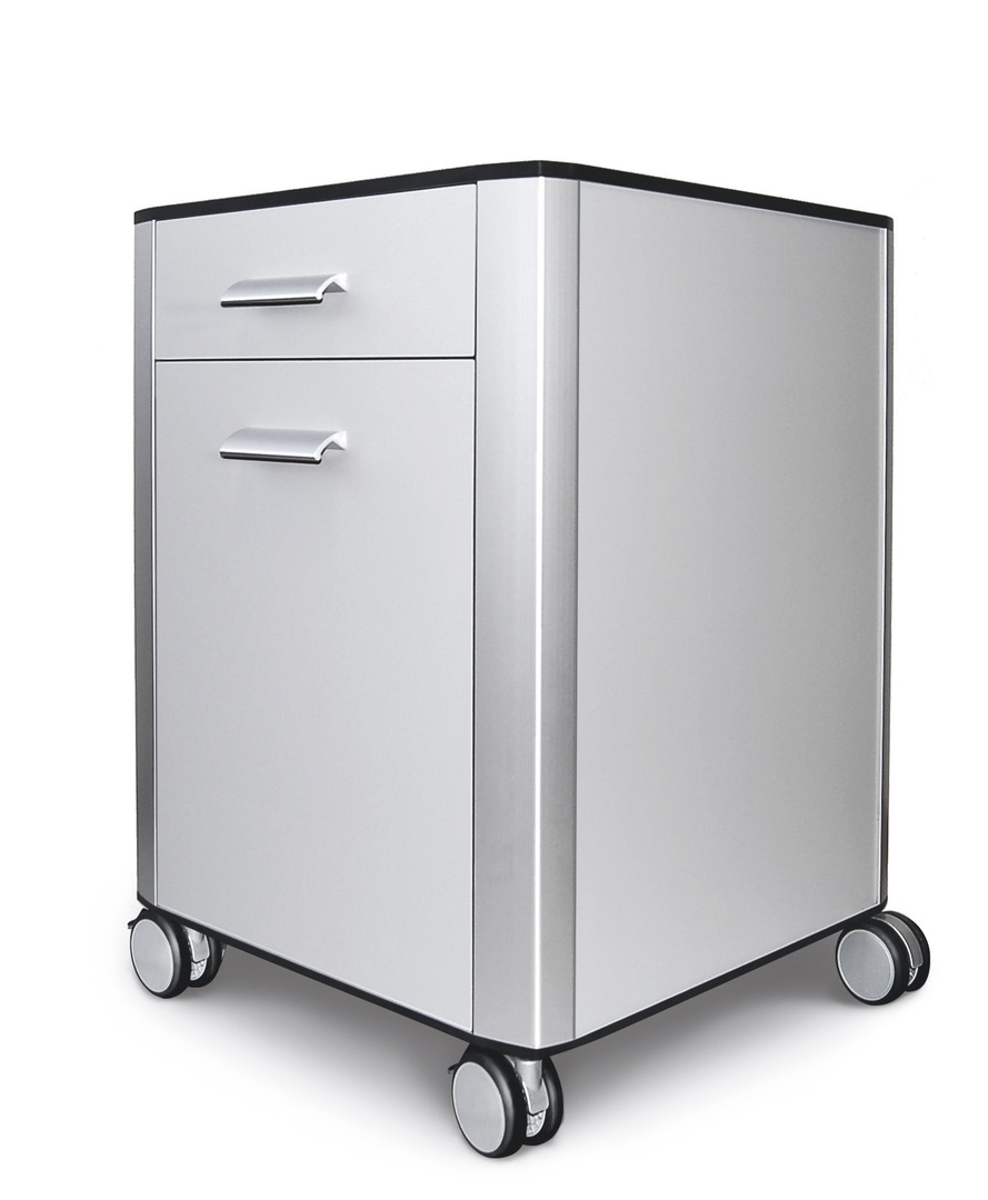 This bedside cabinet looks like an elegant piece of furniture for the home but fulfils all the requirements of hospital furniture. It is made of easy-to-disinfect high pressure laminate (HPL), while the scratch-resistant profiles are crafted from anodised aluminium. Thanks to the double castor wheels, in addition to an overall lightweight construction, the cabinet is easy and safe to manoeuvre. It is available in different storage sizes and a range of colour and surface options.