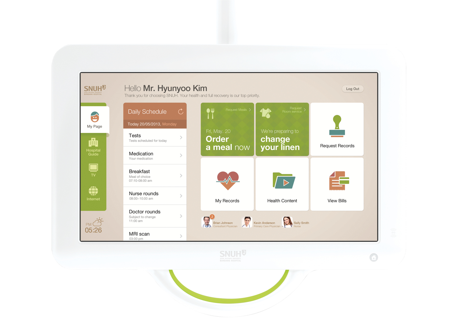 Bedside Station is a personalised medical service platform installed at the bedside for hospital inpatients. Its streamlined timeline interface provides access from a single platform to each patient’s personal schedule as well as timely and relevant information on the various hospital services and treatments. Thereby, patient wait and travel times can be reduced and, at the same time, their hospital experience can be improved. The simple and intuitive interface makes it user-friendly for all ages, from children to the elderly, and the cheerful, relaxing design adds a level of warmth and comfort to the otherwise clinical hospital environment. The icons for TV, Internet or new linen, for example, are self-explanatory and immediately understandable. Thus, the Bedside Station application aims to enhance the experience and satisfaction of inpatients and their caregivers, improving the overall quality of medical treatment and services.