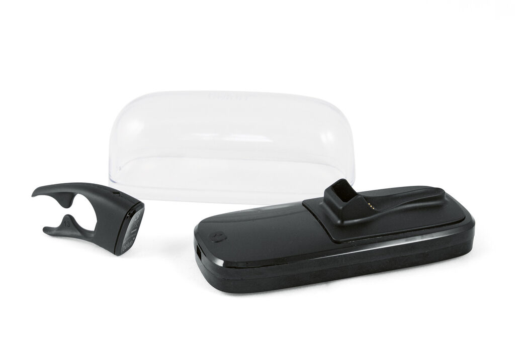 The Belun Ring is a pulse oximeter that is worn like a ring. Data are collected while the wearer is sleeping and transferred to the docking station when the ring is placed on it. The legs on the ring ensure that the sensor stays at the correct spot during the night and that the ring does not rotate. Thanks to its elegant form, black colour and glossy surface, which is inspired by a gemstone, the pulse oximeter looks more like a piece of jewellery and less like a medical product.