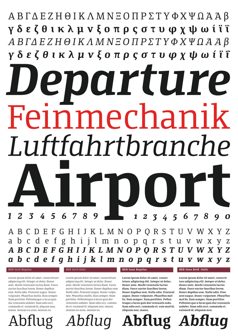 BER is a comprehensive type family that was exclusively developed for the corporate identity and the signage of the new BER Berlin Brandenburg Airport. It comprises serif and sans serif versions, in two and four weights respectively, as well as display and office fonts. In addition, unique incident light and backlit fonts were developed for the airport’s signage. The font allows an international application into a variety of language systems and, apart from Latin scripts, supports languages such as Hebrew, Cyrillic and Greek.
