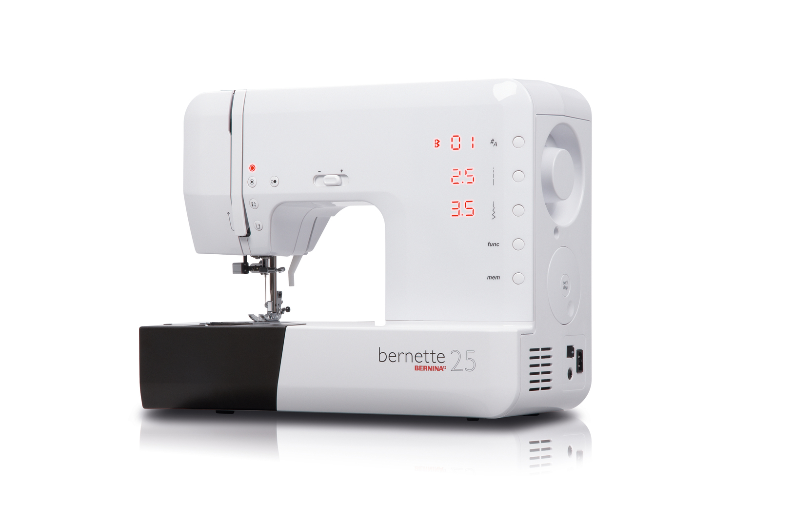 With an eye-catching design the bernette 25 sewing machine appeals to an audience of young and creative sewers. This goal was achieved by cooperating with design students. The smooth, white surface glistens like lacquer while black elements add colour accents. Switching on the appliance the red digital display is projected onto the white surface. Ergonomic selection of the stitch parameters is achieved by the innovative Electronic Selector Wheel, discretely integrated into the right side of the cover.