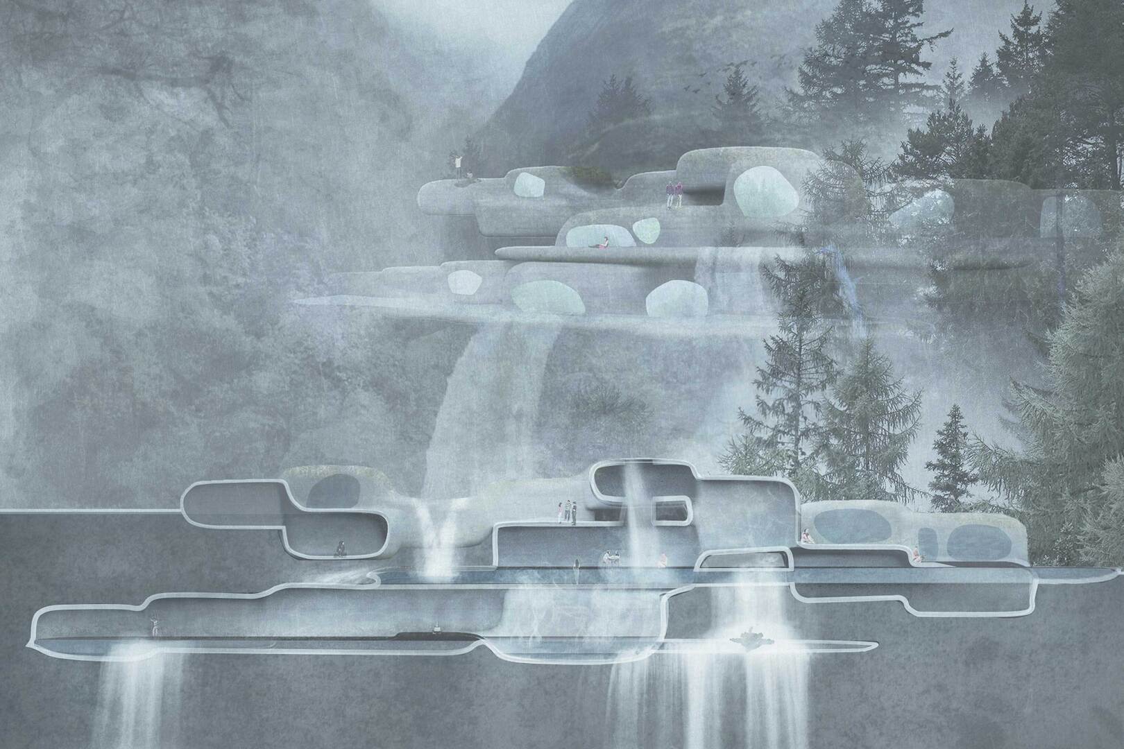 Important spaces of this project are the Lobby – its icy imagery symbolising original thought; the Library – the source of inspiration with an expansive scenic view; the Studio – encased in thick glass that separates the space from the symphony of flowing water; the Living Room – a voluminous space for social interactions; and the Meditation Area – a small natural cave that provides quiet refuge. Finally, the public bath itself is situated within the deepest part of this art centre. A large public complex, it assembles artists and philosophers from various fields, encouraging the exchange of ideas in the most conducive and relaxing conditions. In this space, thoughts become malleable and answers are easily reached.