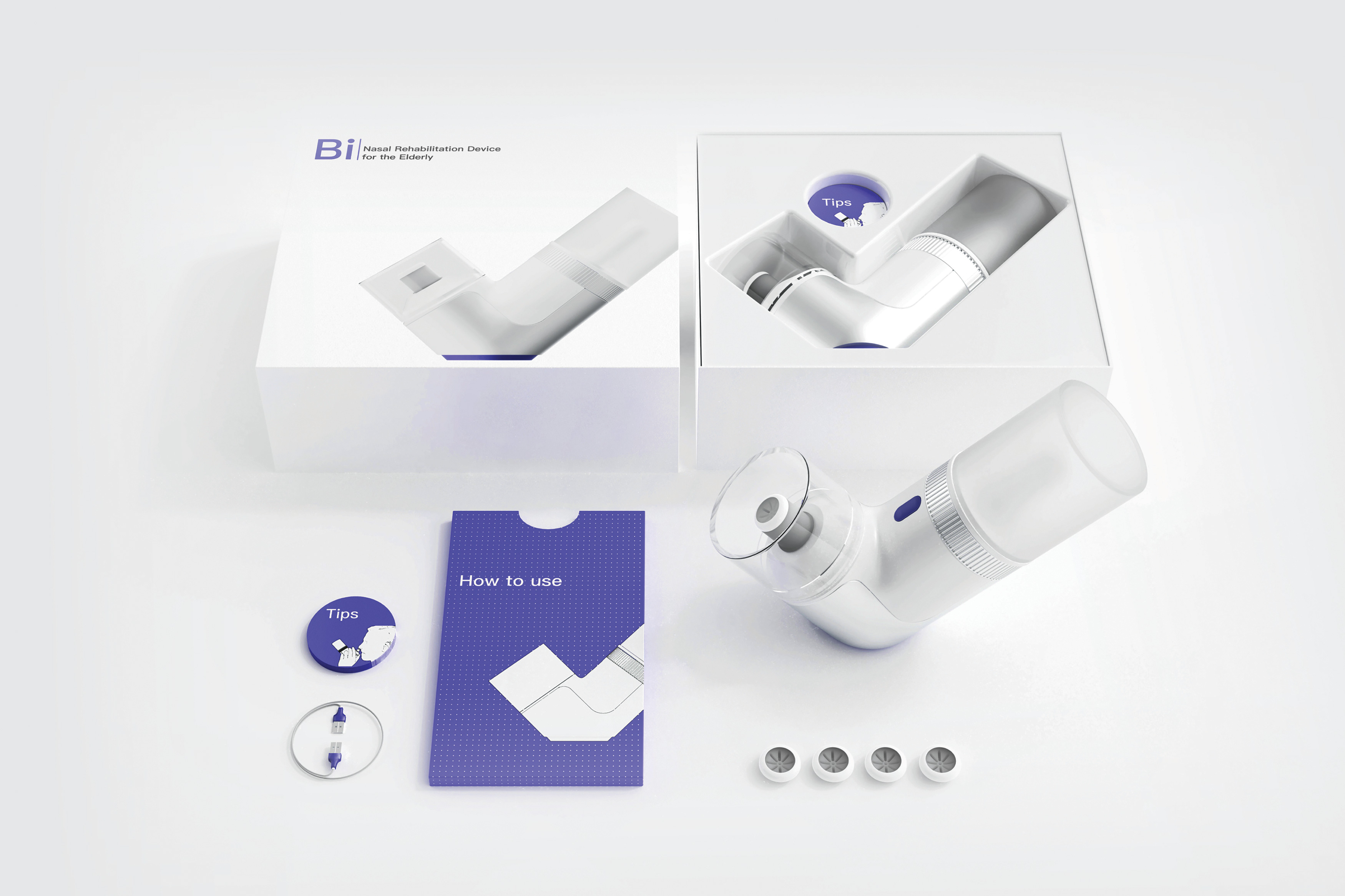 A specialised nasal care device designed to address nasal health issues and weakened mucosal defence in elderly individuals. It employs an atomised spray system that delivers a fine mist at an optimal temperature. The mist flow can be tailored to specific conditions via the adjustable spray nozzle. To enhance treatment, a guided breathing light is integrated to support respiratory exercises. Red Dot Award: Design Concept | Red Dot: Next Gen Award | Concept | Medical Devices and Technology