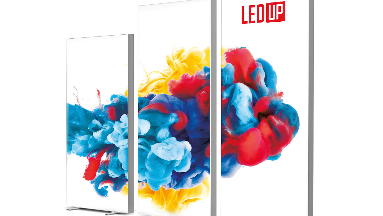 Thanks to a range of add-on modules, the BIG LEDUP mobile backlit display can achieve an impressive size of 500 x 300 cm. The use of the proprietary stainless-steel system connectors allows for different mounting options. Thanks to a specially developed bracket holder, it is possible to retrofit monitors weighing up to 15 kg. The frame is made of silver anodised aluminium with side lighting. It is equipped with the latest LED technology and specially adapted diffuser lenses to guarantee a homogeneous illumination over the entire surface.