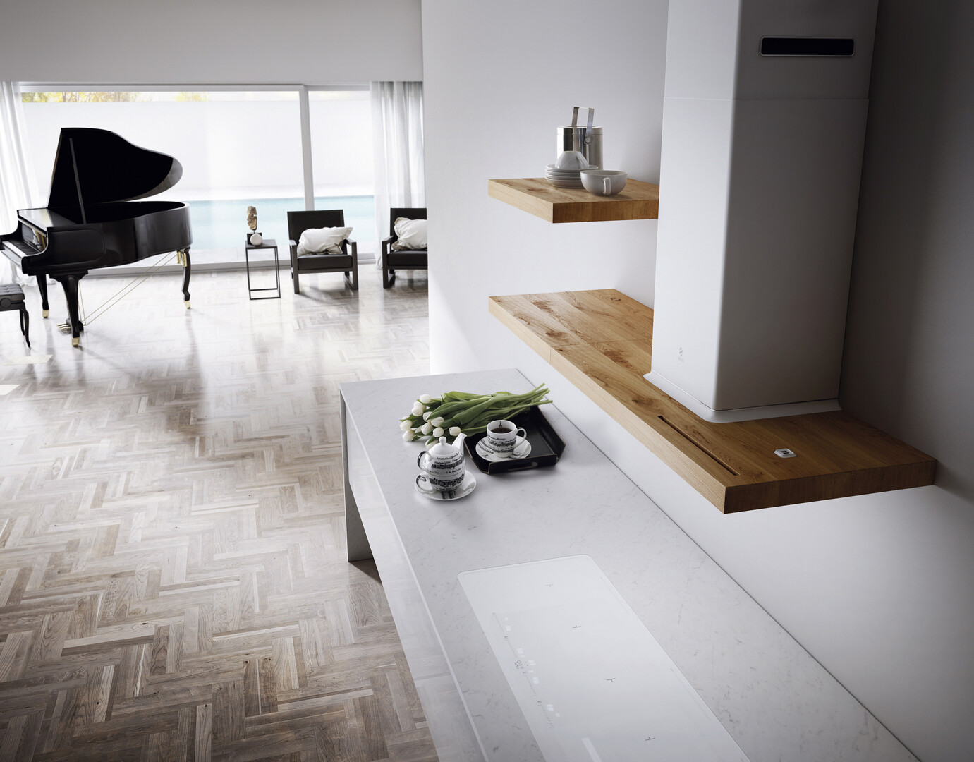 In its design, Bio combines nature with technology, which is demonstrated visually by combining satin white with the natural brown of wood. Bio is a modular system which is constructed to be mounted over an island or on the wall and contains shelves, thus integrating well into the kitchen. Tone and brightness of the working light can be set to the ambient light. Control is by means of a touchpad, via an app or automatically, thanks to integrated sensor technology.