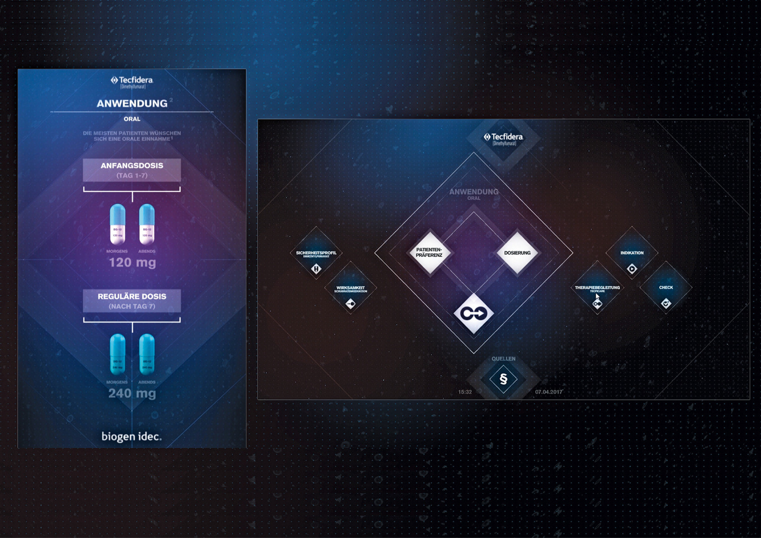 The interactive Biogen Idec infoterminals presented at professional fairs and symposiums follow the clear message that complicated matters are easier to comprehend when the audience is engaged. Each terminal focuses on a specific product. While the intuitive navigation interface on a horizontal table offers a variety of selections, the information displayed on a vertical screen is educational but easy to understand. The design follows a clear visual pattern and relies on the recurring square icon for buttons and content arrangement. 3D models help to clarify complex processes.