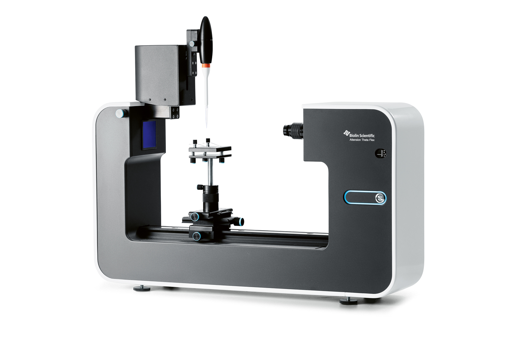 This optical measuring instrument for determining surface tension offers an outstandingly user-friendly and extremely precise manner of interaction. Markings with blue accent colour ensure good user guidance, while the differently sized thumb screws allow different parts to be set precisely. In addition, Theta Flex also impresses with its highly practical modular structure. This enables the instrument to be used cost-effectively in both research and industrial areas of application.