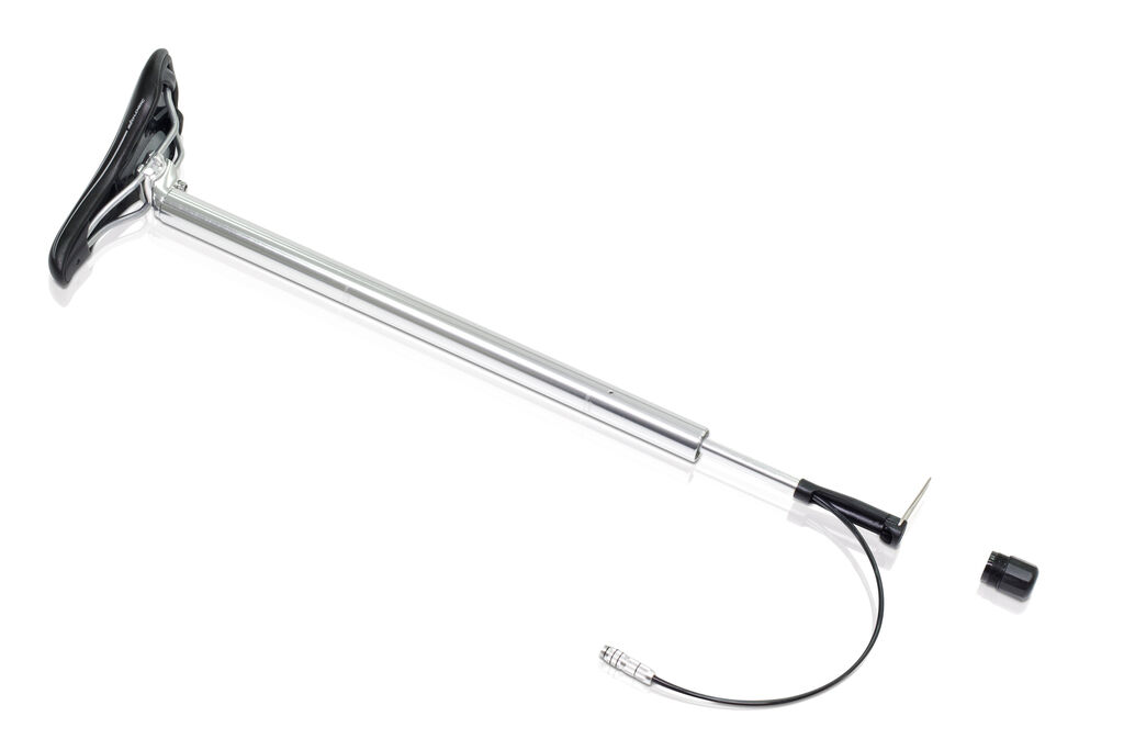 The BioLogic PostPump 2.0 is a high-performance bicycle pump that is discretely ensconced within a seat post. The ergonomic design, which features a stainless-steel, fold-out foot stand, allows the saddle to be turned into a handle, thus enabling cyclists to pump up a tyre while standing comfortably. They simply need to pull out the pump of the seat tube, flip out the foot rest, extract the connecting hose, and choose the appropriate aluminium adapter for either a Presta or a Schrader valve.