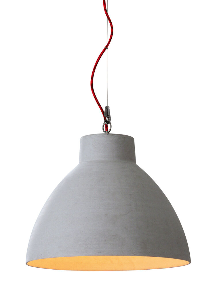 Bishop appears to be a pendant luminaire made of concrete. Due to an innovative manufacturing technique, the problems with some of the properties of this material, such as weight, fragility, discolouration as well as dust abrasion, could be solved. The luminaire, which is cast in one piece, showcases a timeless appearance with gently curved lines. The pleasant colour temperature of 2,200 to 2,700 kelvins is reminiscent of candle-light and bathes the room in a romantic atmosphere of light. The red power cord forms an appealing contrast.