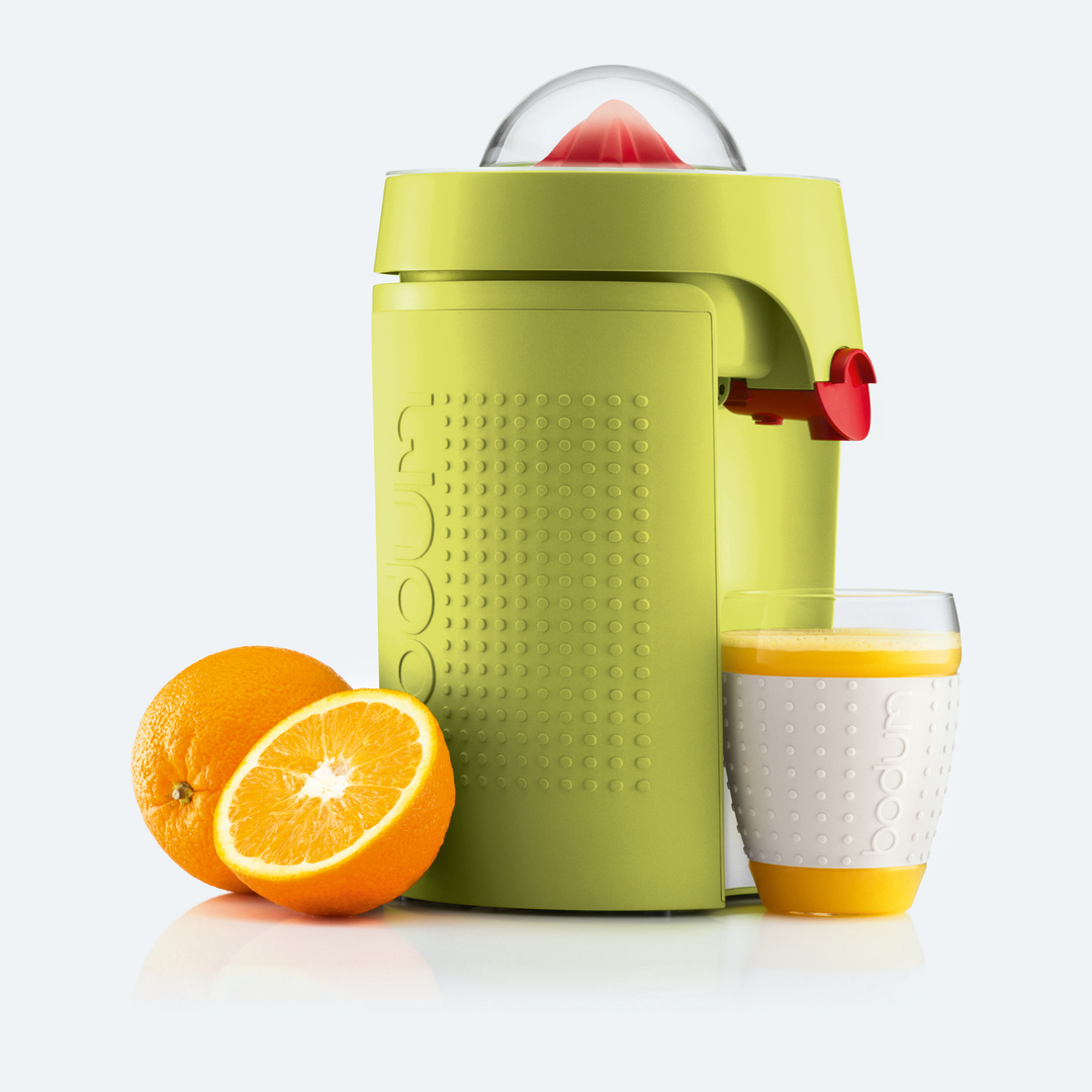 This electric juicer derives an independent character from its colourful and distinctive design concept. In addition, the compact unit, made of plastic, silicone and stainless steel, ensures easy handling: the high spout makes it possible to fill even large glasses. As an added benefit, a drip stop prevents staining of the kitchen worktop. The device is fitted with a cyclone-function which centrifuges the last drop out of the strainer and guarantees it to land in the glass.