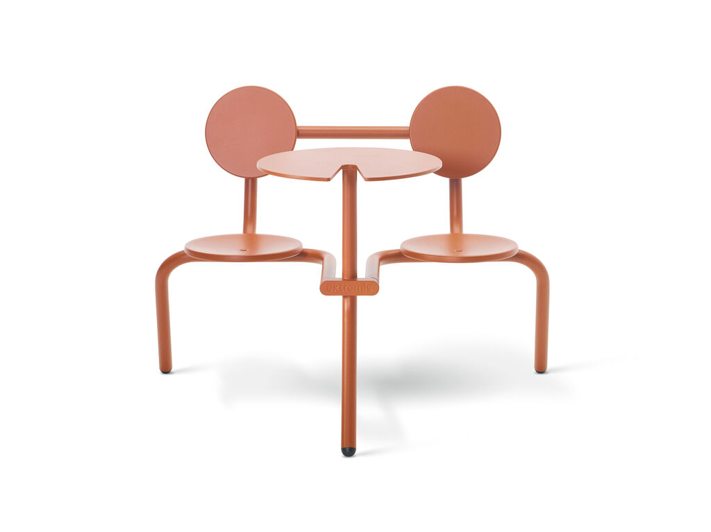Instead of sitting opposite each other, Bistroo invites people to sit side by side, allowing them to watch the surroundings together, as if in a bistro in Paris. The sturdy construction combines two seats and a table into a space-saving piece of bistro furniture. Standing firmly on only three legs, it grants guests more legroom and allows restaurant and bistro owners comparatively quick stacking. The double “o” in the product name refers to the two circular backrests.