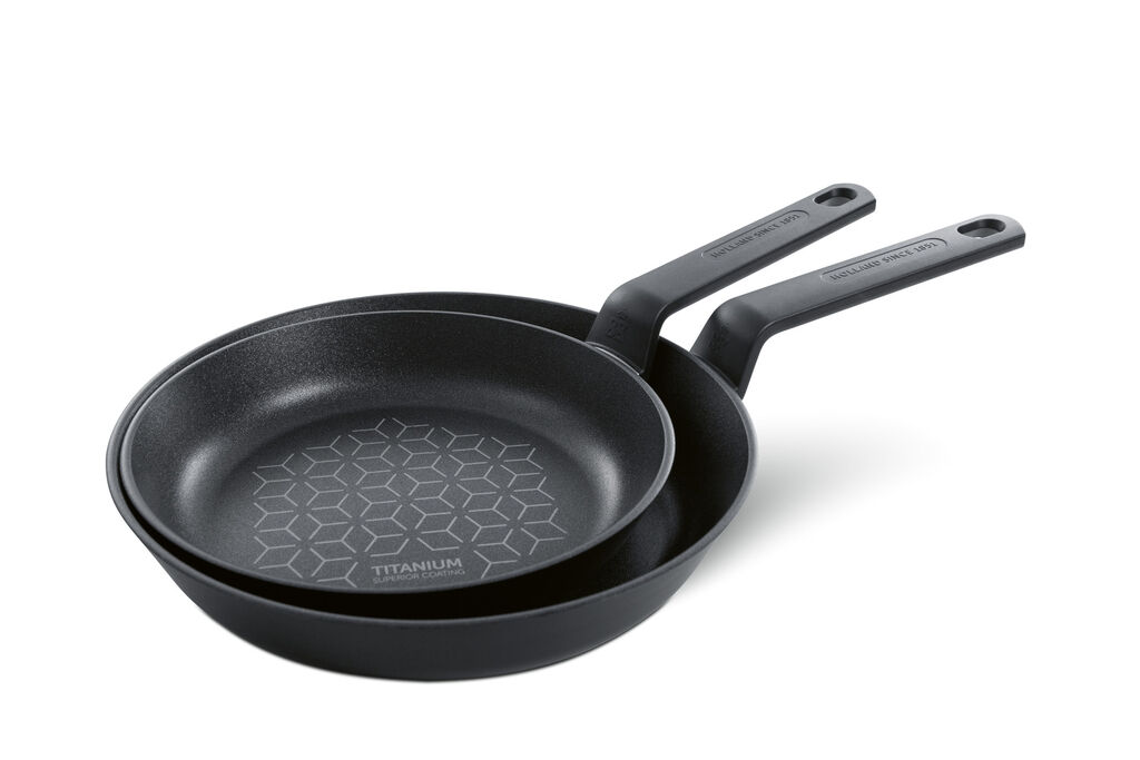 Inspired by professional French cookware, this range of frying pans uses high-quality materials and is made in a particularly sophisticated manufacturing process: in order to ensure lasting scratch resistance, the pans are hardened by titanium particles, applied onto the surface by plasma spraying. In addition, they feature a Teflon coating, which guarantees good non-stick properties. The 6.4 mm thick base of the pans is reinforced with a full steel bottom, which optimises the heat transfer. The special shape of the handle makes the pans stackable.