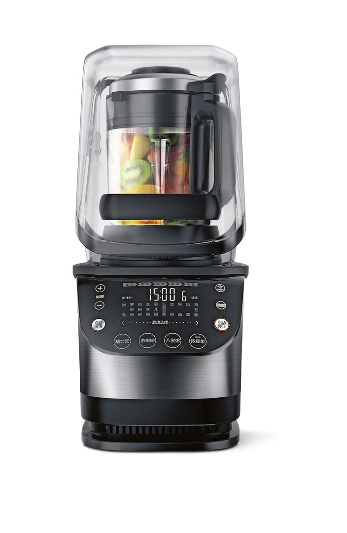 The material mix of stainless steel and black and transparent plastic indicates sturdiness. The generously inclined user interface contributes to the user-friendliness of this multifunctional power blender.