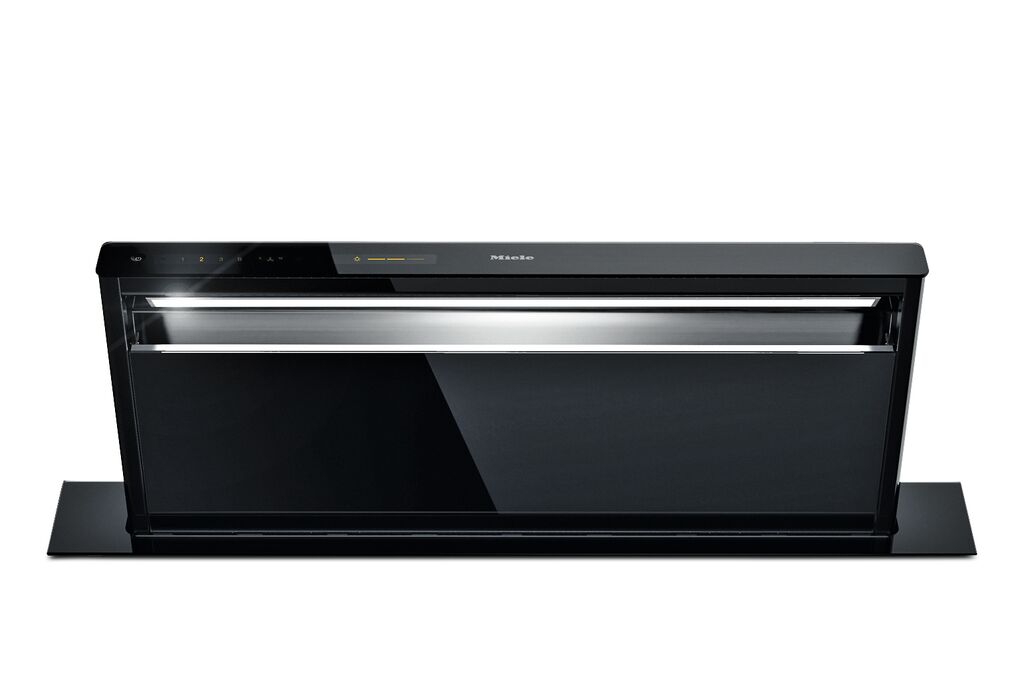The cooker hoods of the Black Levantar series are discreetly integrated into the working area behind the hob. This way, only a black strip of glass is visible when the appliance is switched off. A gentle depression in the glass screen marks the on/off control and indicates the presence of ventilation technology in the base unit. Thanks to smart functionality, suction power automatically adapts to the cooking situation on the hob. Also, convenient control is possible via an app, and perfect illumination of the neighbouring hob is provided at all times due to the dimmable, three-stage LED lighting.