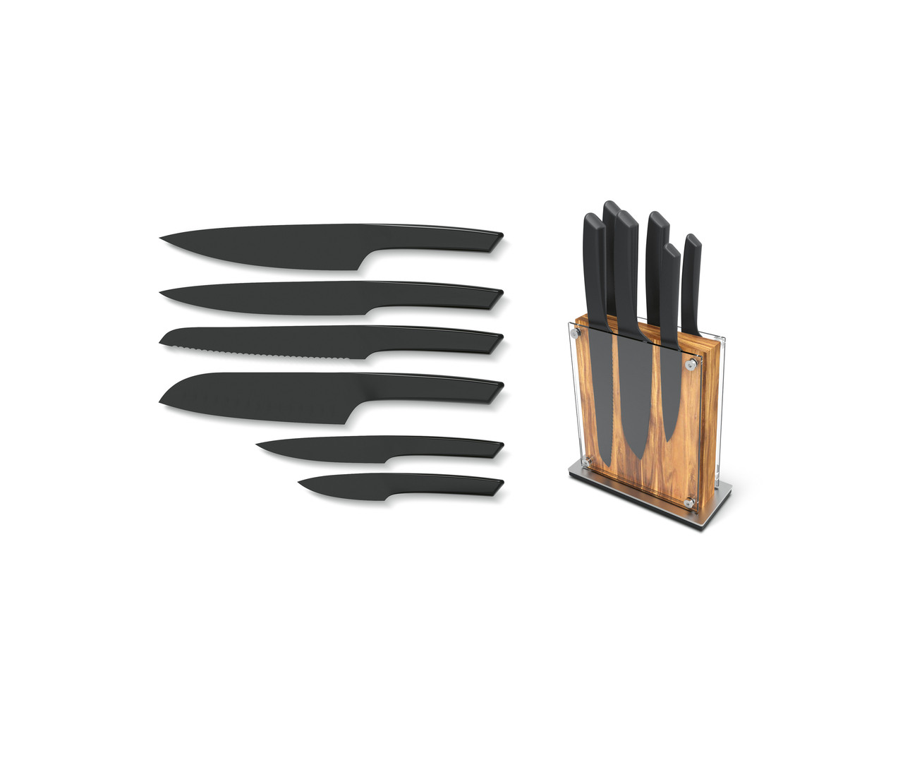 The streamlined design of these kitchen knives ensures comfortable handling. Their arched handles are hollow on the inside and feel very light in the hand. Another distinctive feature is the black oxidised stainless steel surfaces, boasting a material quality which contributes to hygienic food preparation. The knife block consists of a beautifully grained piece of wood with two precisely fitted acrylic sides, revealing the blades of the six different knives.