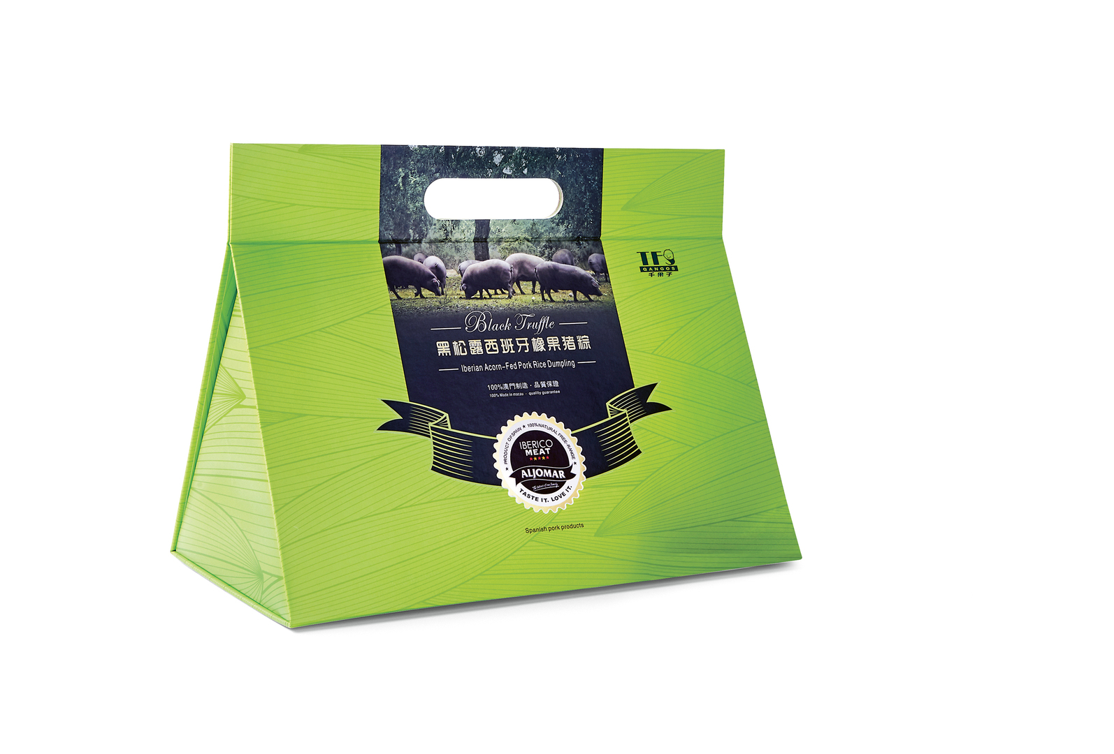 The inspiration for this design stems from the triangular shape of traditional reed leaves which are stuffed with rice and called “zongzi” in Chinese. The special feature of the design for this packaging is that it combines a box containing dumplings with the functionality of a carrier bag. The refined folding technique applied makes it quiet simple to efficiently produce those handy bags, which are also friendly to the environment and easy to carry. The packaging has a pattern depicting tender green reed leaves which suggests freshness. Additional photographs show the ingredients used.