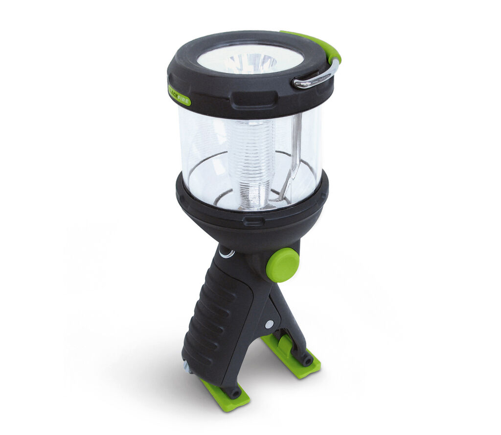 The Clamplight Lantern is a lantern that can be clamped to branches, tents, back packs and boats. This makes it ideal for backyard barbecues and suitable for lighting outdoor workspaces. The lamp may also be placed on the ground, as the clamping mechanism can lock open to stand. The head articulates to get light where you need it. The user-friendly device features a clear design and also can be used as a flashlight.