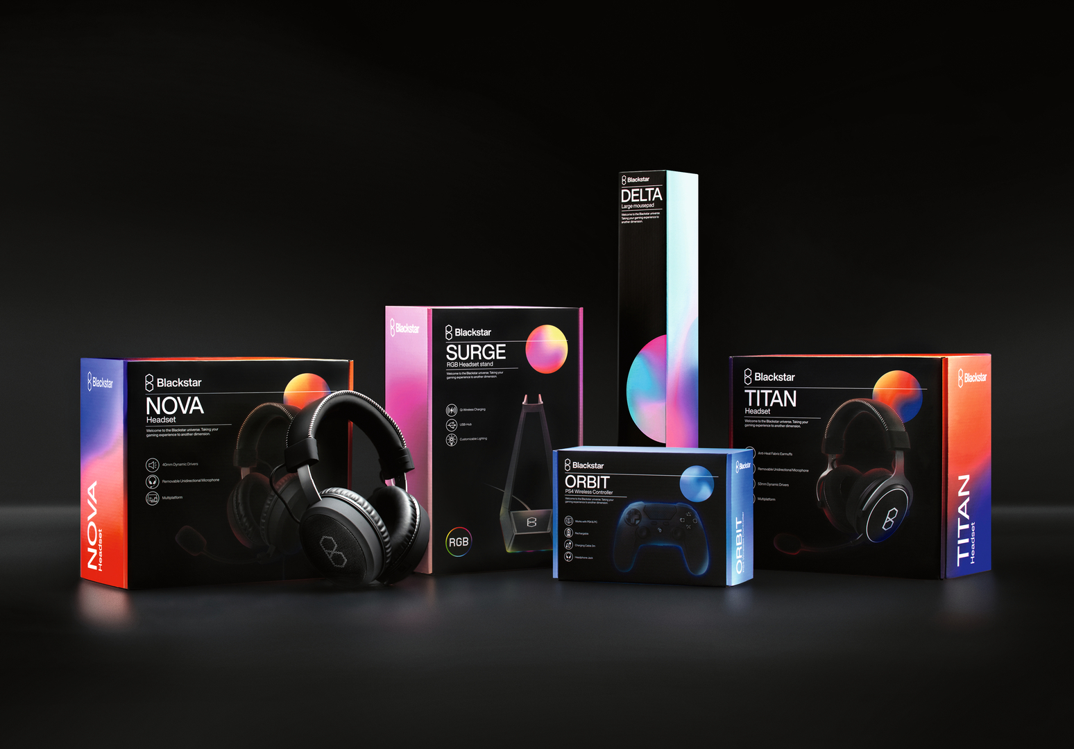 This packaging for the retail chain Teknikmagasinet was designed to meet an increasing demand for more affordable e-gaming equipment. It is part of a new product line under the company’s own Blackstar brand. The concept revolves around the idea of a vast alternate universe for gamers to explore. In the “darkness of empty space”, all products are visualised as glowing planetoids, each with a unique name and bold colour scheme. The idea implemented here is that each product adds its own special light and life to the Blackstar universe, making it a vibrant and strong visual world.