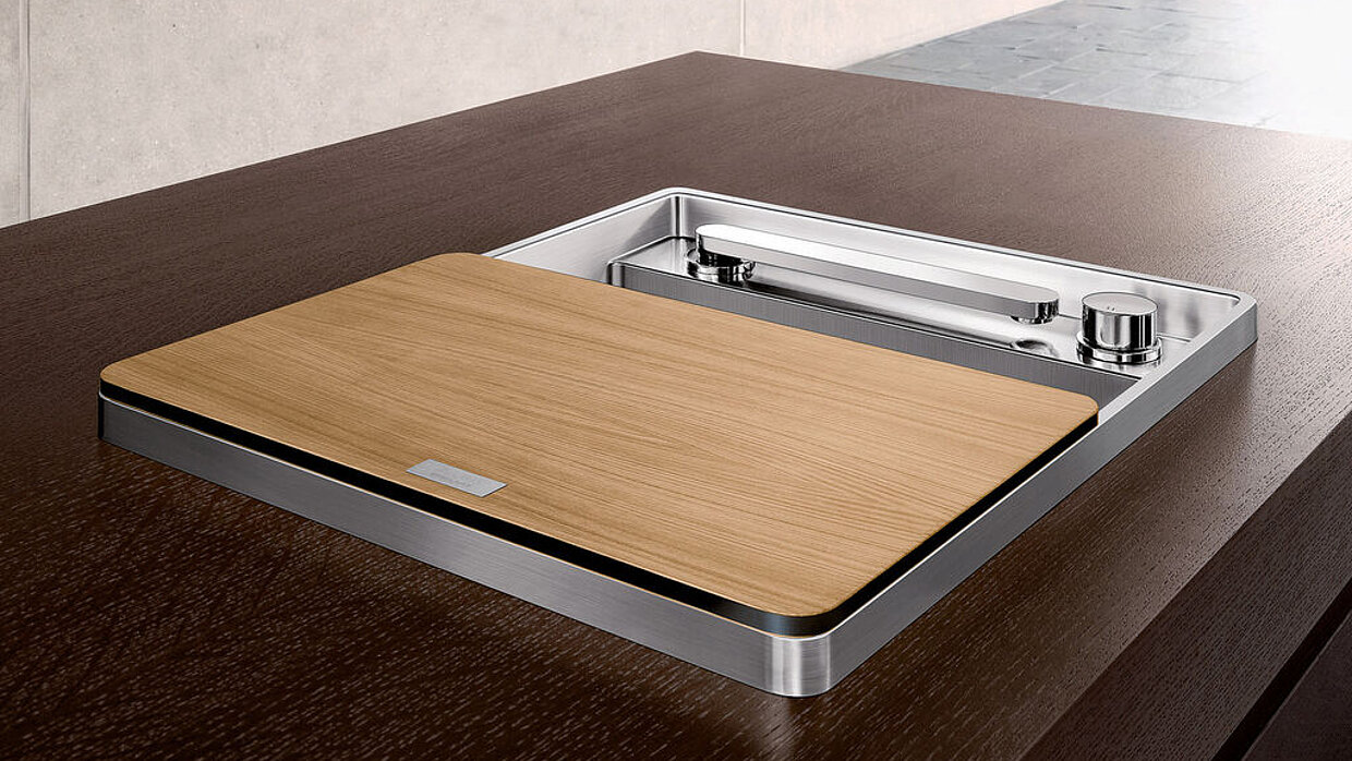 Characteristic for this minimalist, stainless steel sink is the symmetric arrangement of two equally sized squares for basin and drainer as well as the elegantly centrally placed mixer tap ledge. The frame is flat-fitting with gently rounded, parallel contoured corners and is matched to the balanced geometry of the basin. Thanks to the clear form language and high-quality impression of the material, the sink merges harmoniously into modern kitchens.