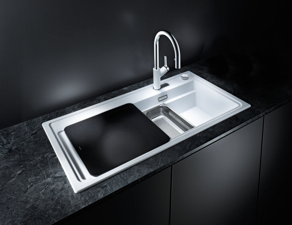 The Blanco Zenar XL 6 S Steamer Plus sink has been designed especially for households with steam cookers. Thanks to narrow ledges running along the largely dimensioned bowl, cooker containers of various makes can be easily placed in the bowl for filling. The ingredients can be prepared on a sliding cutting board and put directly into the cooking container which hangs a little lower down. Accessories to the sink include, apart from the cutting board, also two cooking containers with lateral perforations for even cooking.