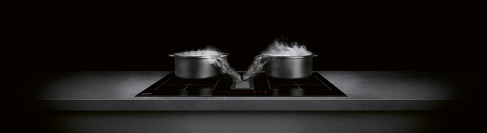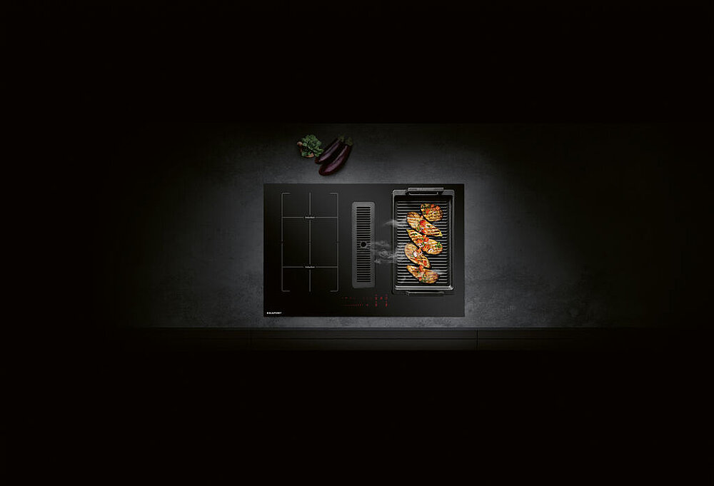 The frameless Blaupunkt 5IX80290 induction hob has an integrated extractor fan with 10 power levels that activates automatically during cooking. It is placed centrally between the two induction hobs and thus extracts the fumes quietly and directly at their source. In addition, two cooking zones can be combined into one single zone. The product has many innovative functions that enable both flexible cooking and grilling. Especially the innovative extractor fan is convincing, said the jury. A clearly arranged display with a slider can be operated intuitively, even with wet fingers, and an overflow detection system ensures clean working.