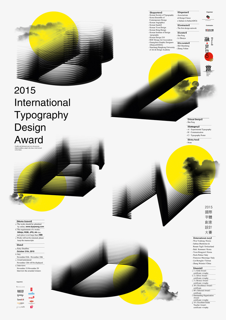 The poster announces the 2015 International Typography Design Award. Its title, Blend, itself becomes the motif. Reduced to its individual letters, which appear as if written in ink, the word is rearranged and depicted with a three-dimensional effect. In this process, different techniques as well as cultures join and merge. Western script and Chinese craftsmanship are combined to form a harmonious whole. The Chinese ink art elements give the unadorned Latin letters a warm and impactful framework.