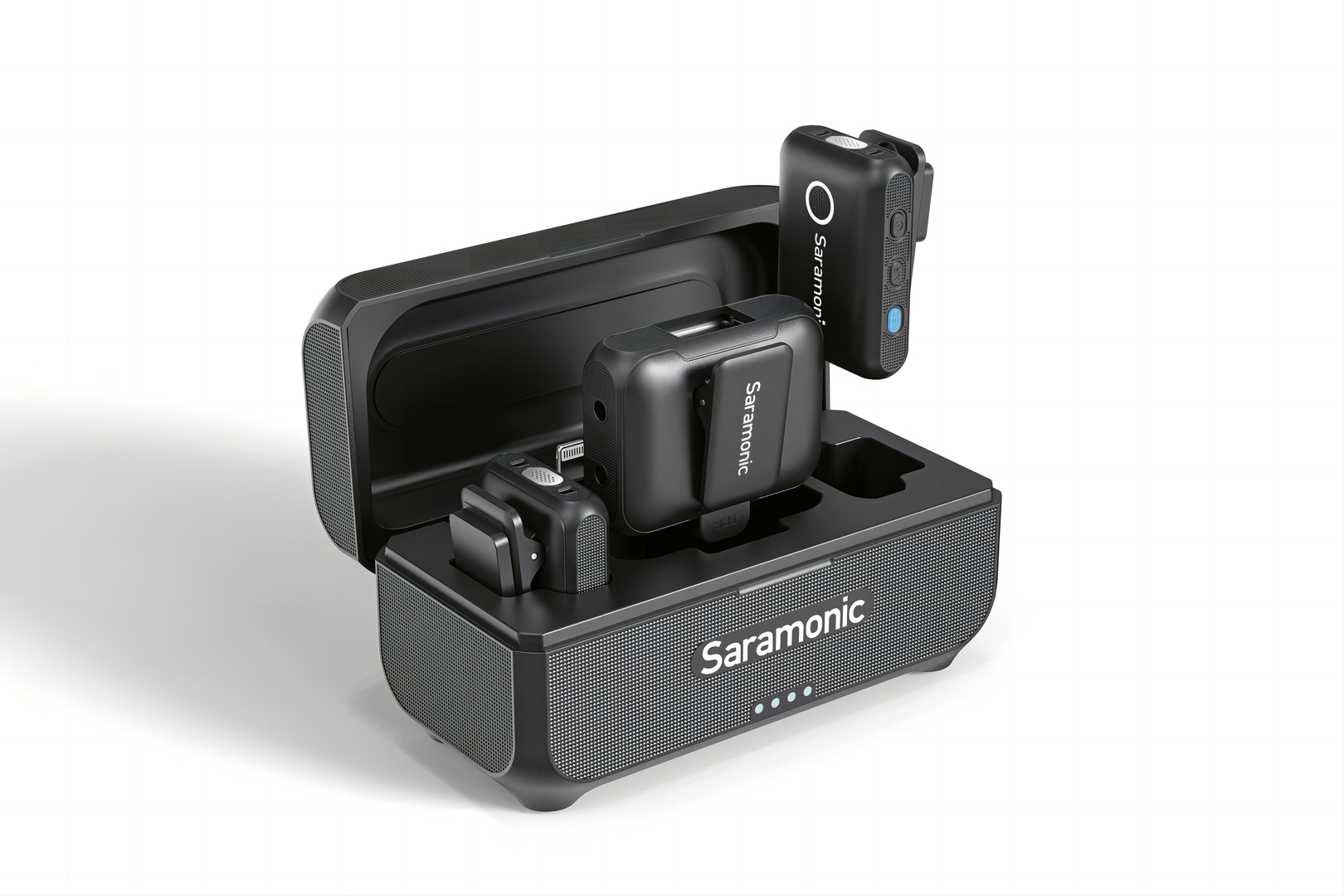 The cordless microphone pickup Blink500B2+ is handy, lightweight, and reliable, making it ideal for use on the go. It offers content creators impeccable audio performance and numerous practical features. The set integrates a USB-C and a Lightning adapter, an RX audio receiver, and two TX audio transmitters, as well as a cordless charging case. Noteworthy is the extended battery life of the receiver and the two transmitters, allowing the user to focus on their work without interruptions due to charging.
