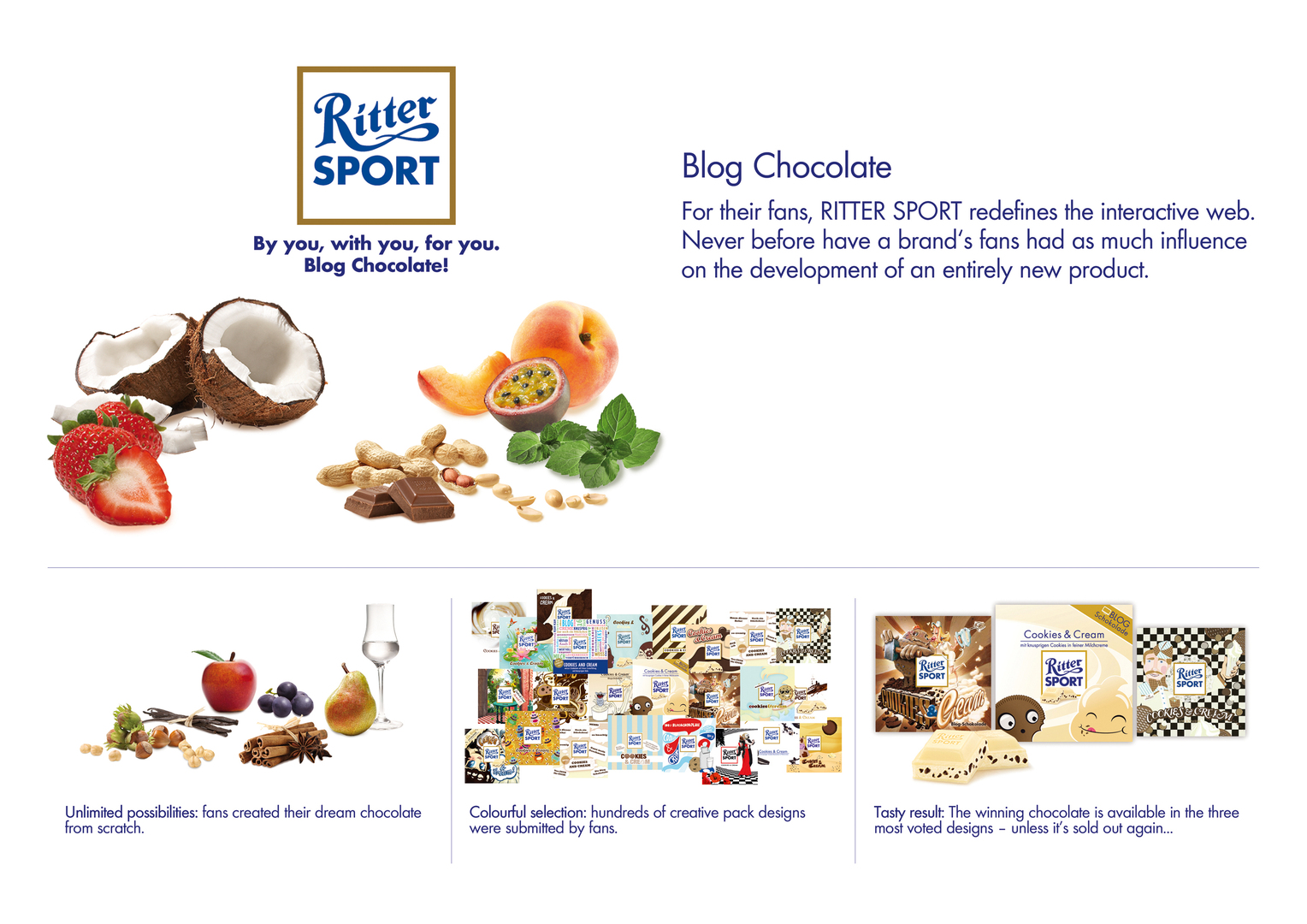 With this crowdsourcing campaign, the Ritter Sport brand aimed to redefine the interactive web for their fans. The “Blog Chocolate” concept implied a new kind of crowd sourcing event, giving the brand’s fans full power over the development of a new product. Users were invited to invent a new chocolate product and submit it to a vote. The winning chocolate, Cookies & Cream, was then produced by the company. The campaign reached 30,000 Ritter Sport blog readers and achieved lively participation on all brand platforms – entirely without a media budget.