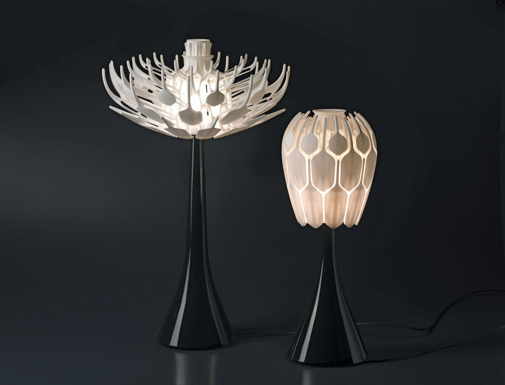 Inspired in both form and function by a flower’s calyx as well as an earlier .MGX model called One_Shot.MGX, the Bloom table lamp’s lampshade can be both opened and closed. When the shade is open, the light is brighter than the soft light it emits when it is shut. As with the One_Shot.MGX, the shade, together with its hinges, is printed in one piece in 3D technology. In just one movement, the shade opens from a bud to the shape of a flower in full bloom. The Bloom lamp’s unusual design opens up new possibilities for 3D technology.