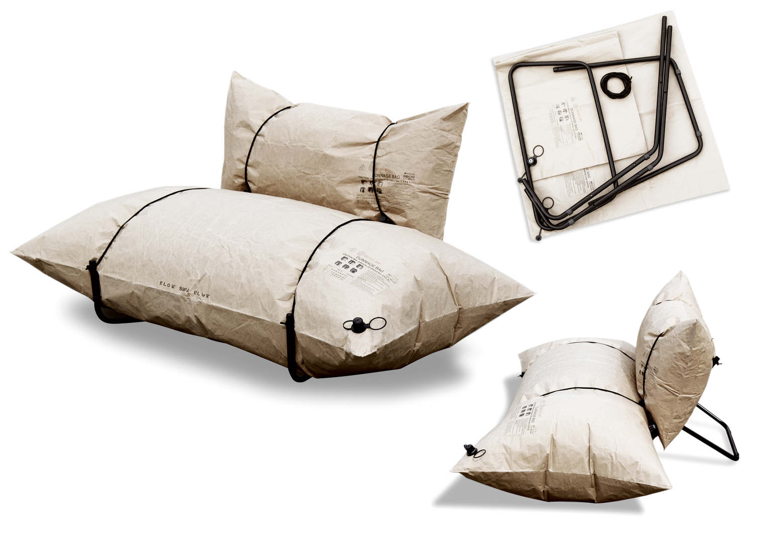 This sofa was made using 100 per cent recycled paper storage bags, a metal frame and rubber straps. It is easy to transport when flat-packed and is inflated for use. Every bag can be personalised simply by using a pen. If it gets dirty, it is not expensive to replace. The bags consist of two layers of Kraft paper and a single ply plastic layer. They can withstand a pressure of two tonnes and, furthermore, the paper is waterproof.