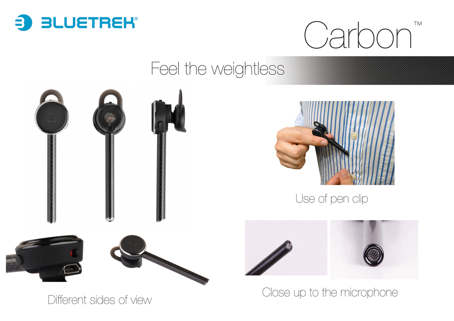 The housing of the Carbon Bluetooth headset is made of extremely light-weight and sturdy carbon fibre, giving the headset a total weight of less than 6 grams. The battery is precisely positioned inside the slim 5 mm diameter boom in order to distribute the weight of the headset optimally in the user’s ear. This weightless balance, along with ear buds in different sizes ensures optimal fit and wearing comfort.