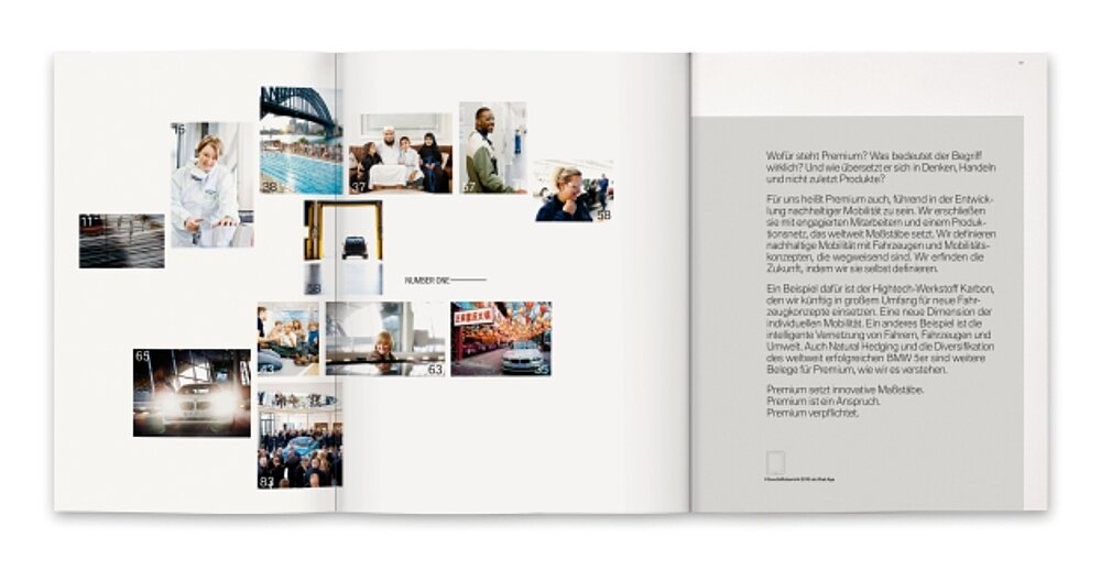 This Blue Angel certified annual report by BMW Group is the third part of a trilogy focusing on the topic of sustainability as a marketing strategy. The report is divided into four chapters, each designed to individually reflect on their topics. Held in a documentary style, the images place people at the heart of the subject matter. The repeated images on the covers serve to illustrate the link between people and cars. While the main cover shows a scene from the people’s perspective, the cover of the image brochure shows it from an external perspective.