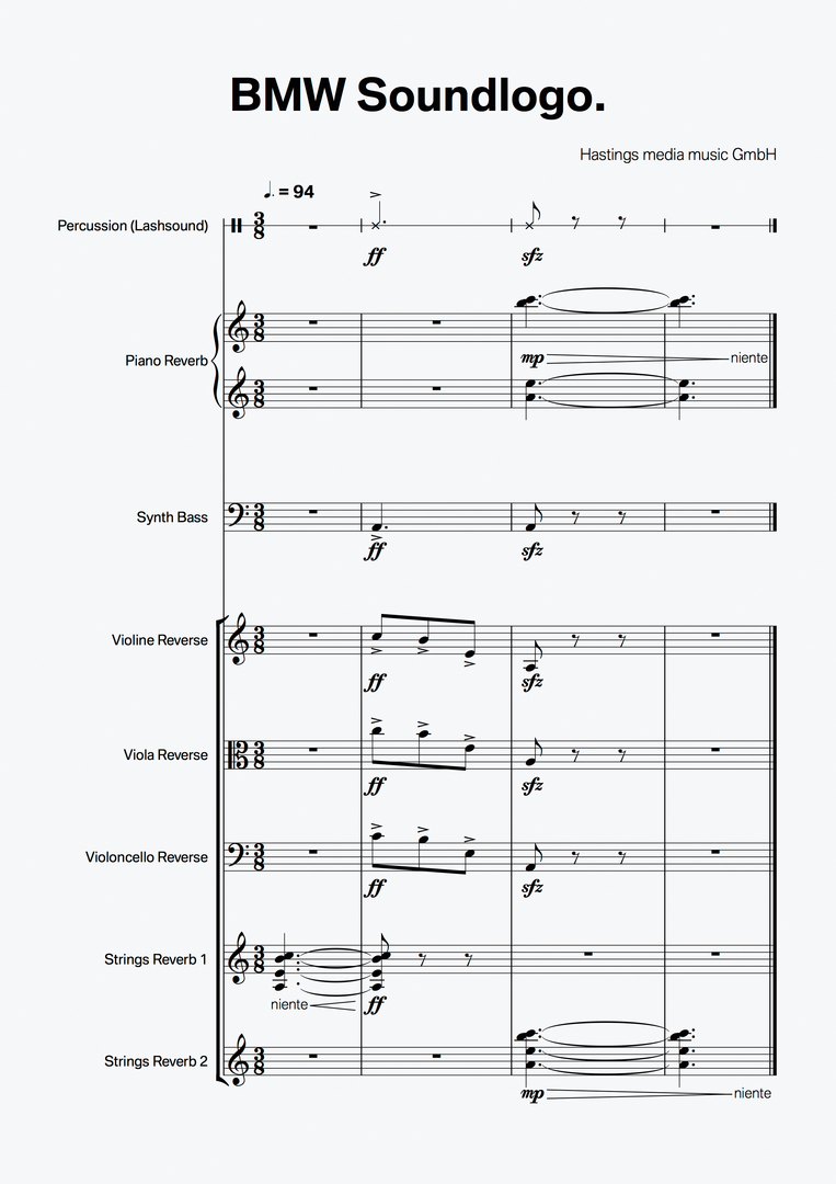 The BMW sound logo was developed with the aim of creating an acoustic business card for the brand. It is characterised by a catchy melody, which has strong recognition value thanks to an innovative mix of sounds. Acoustic elements are played forwards and backwards in a way that symbolises flexible mobility. The melody is introduced by rising, resonant sound and underscored by two distinctive bass tones that form the logo’s melodic and rhythmic basis.