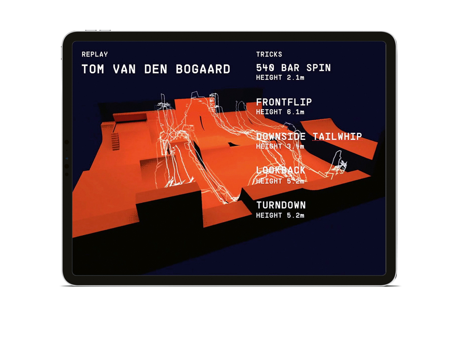 The platform was used during the Dutch National BMX Freestyle Championships. The riders were equipped with sensors that transmitted their riding data such as position, acceleration, height and rotation, data which was then used to visualise the path of each rider on a large screen. This was complemented by information about the tricks that the riders had just performed, so that the audience, jury members and not least the riders themselves could get better insight into the performance. The key colour was the Dutch national colour orange.