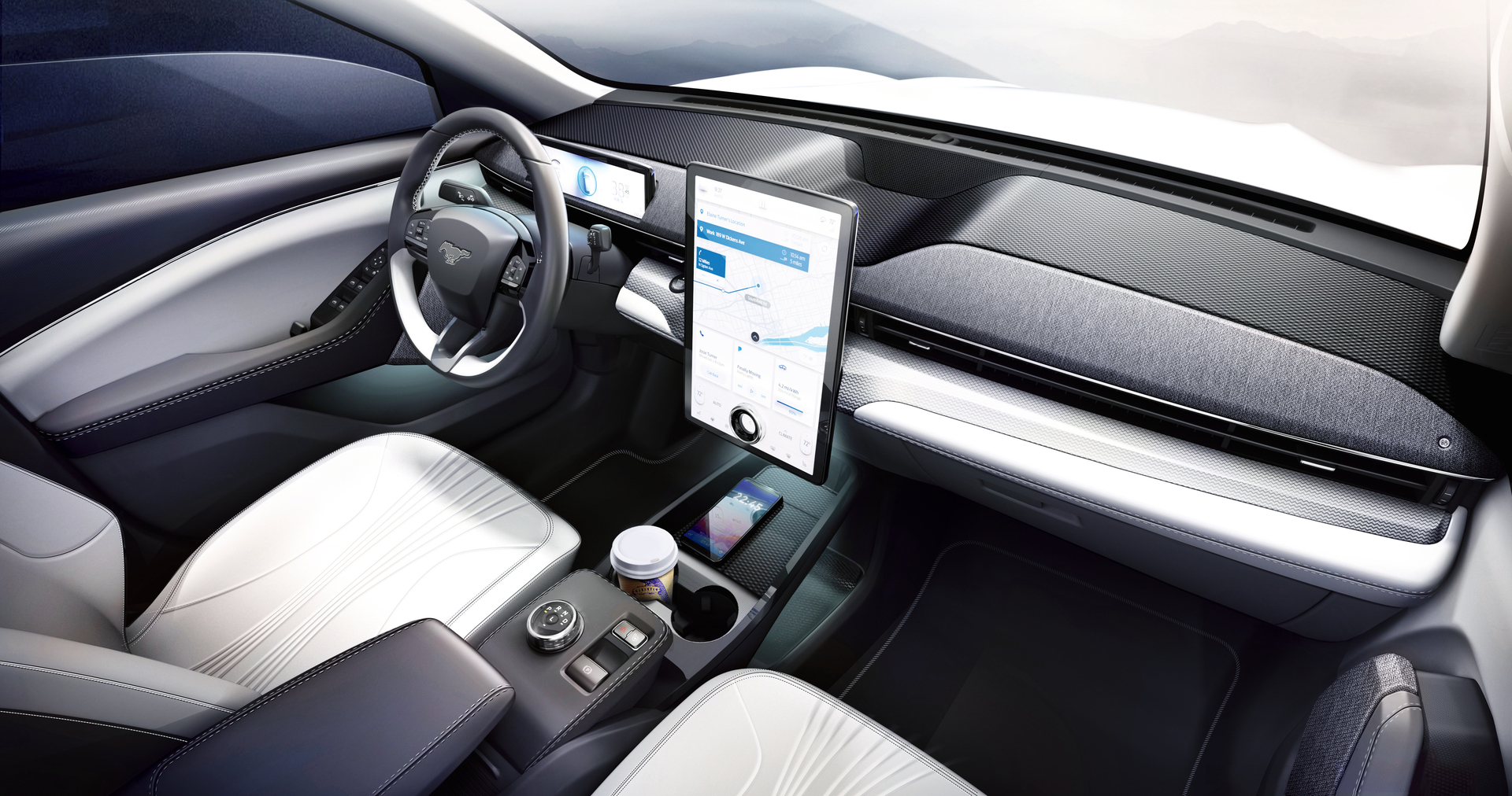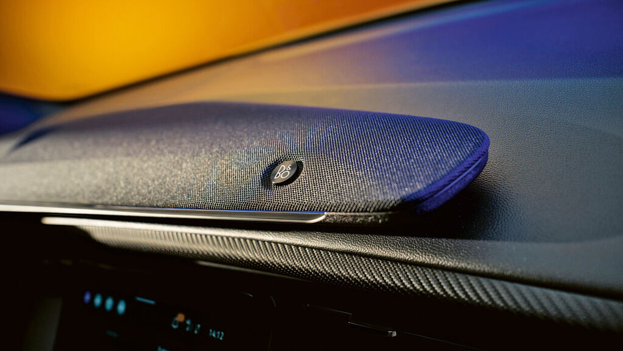 This customised 560-watt audio system, which integrates efficient speaker technology, was specially developed for the all-electric and hence remarkably quiet Ford Mustang Mach-E. The system is characterised by elegant speakers with the appearance of a soundbar that are set into the dashboard and generate superlative sound. The focus is a fabric-covered speaker array inspired by B&O’s speakers covered in Kvadrat textiles.