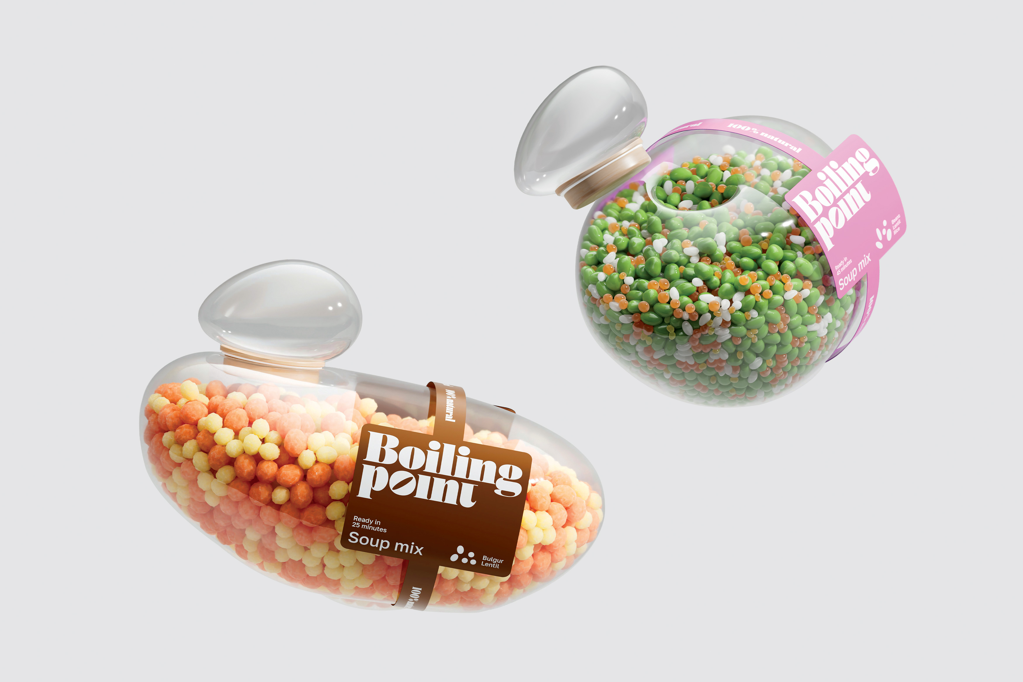 Boiling Point's eco-friendly packaging design for the soup kits mimics the imagery of liquid bubbles forming in boiling soup. Each packaging is uniquely shaped and fillable with cereals or other soup ingredients. The use of transparent materials showcases the contents, which creates visual appeal and aids consumer decision-making. Reusable and recyclable, they also promote sustainability and mindfulness in meal preparation.