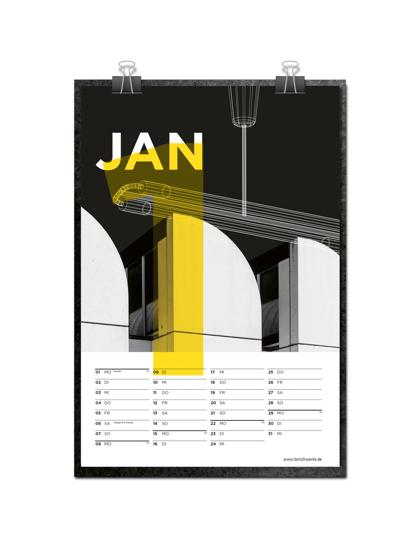 This calendar, entitled “Form folgt Funktion” (Form follows function), places the lamps from Bolichwerke in the context of Bauhaus architecture. The 12 motifs show what the products have in common with the minimalist art movement: a love of purism, of clear forms and of materials. The lights are staged graphically as three-dimensional grid models superimposed by images of modernist architectural structures. The use of natural paper as well as a binding made from two bulldog clips on black MDF gives an air of simplicity. The elegant black and white colour palette is partially overprinted with neon yellow.