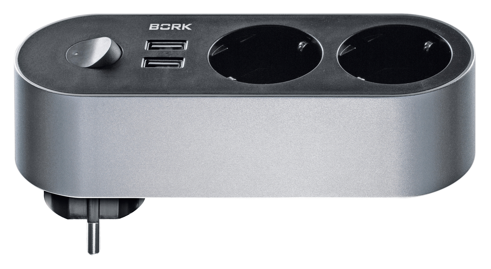What makes the BORK AA581 different from standard double sockets is the addition of two USB ports that are identified by a hidden symbol which only illuminates when charging begins. The double adapter has a stark appearance and merely comprises a master switch in an elegant and ergonomic design. The practical appliance is simple to use and pleasantly soft to the touch.