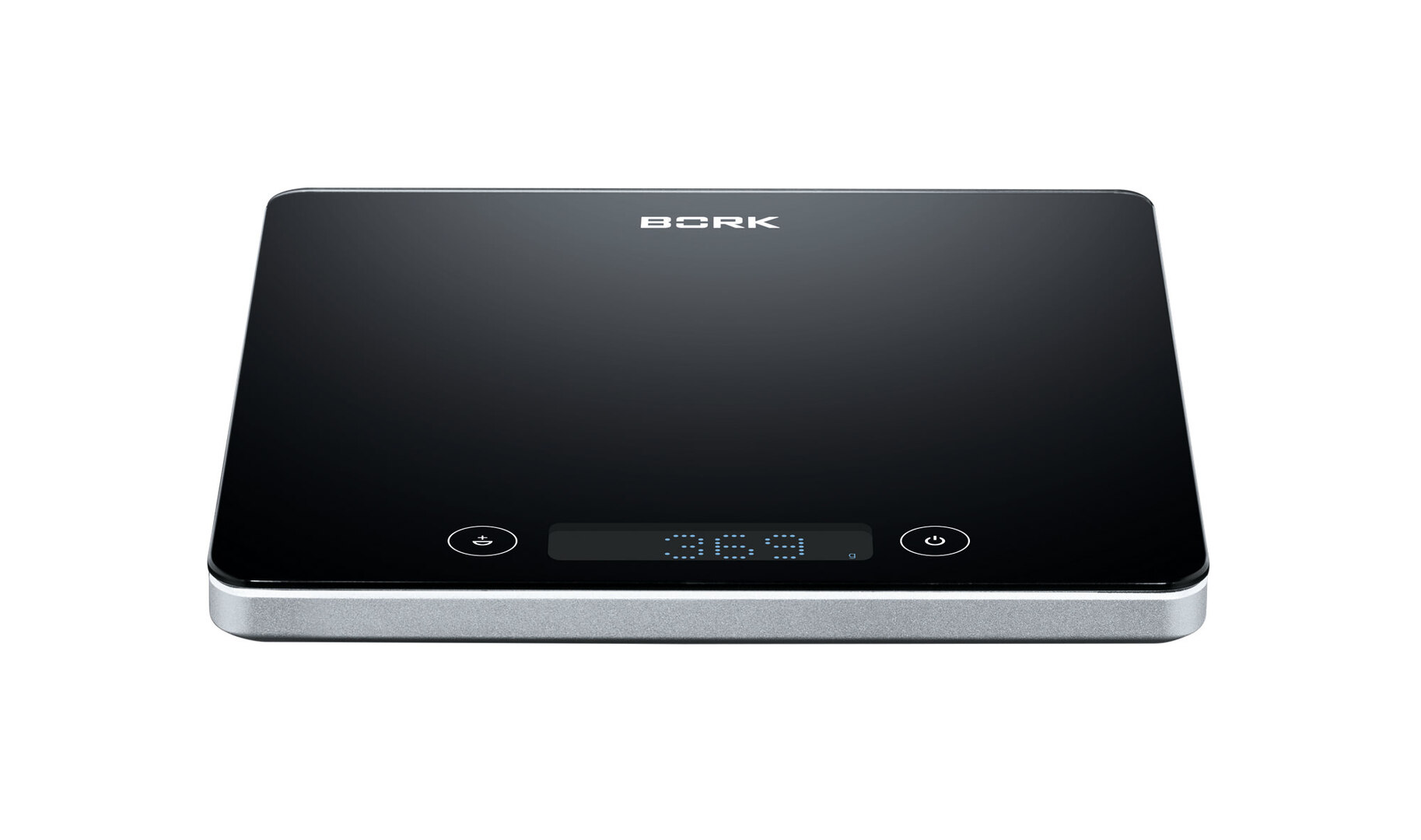 Bork N780 is a robust kitchen scale with a high contrast LED display ensuring high readability. The display and the two touch sensors stand out from the contrasting black glass surface in a visually appealing way. The base of the scale features an anodised aluminium surface with a pleasant, smoothly polished finish. Thanks to its flushly connected glass and aluminium surfaces, this kitchen scale is easy to clean.