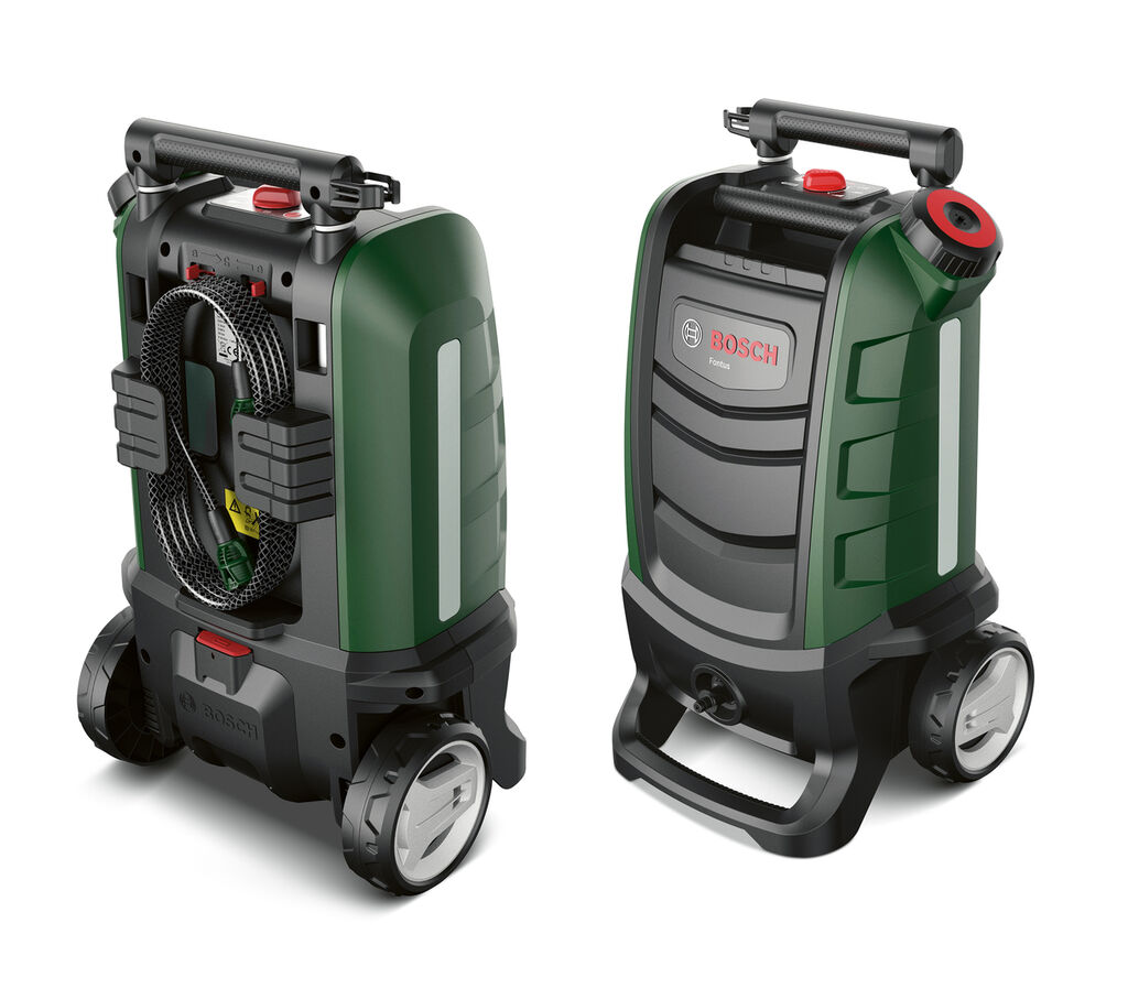 Fontus is a battery powered low-pressure cleaner designed for use in home gardens and on the go. It offers three pressure levels with a maximum water pressure of 15 bar. In addition, the spray pattern can be adjusted as required. Thus, the water jet can be gentle enough for a dog shower and powerful enough to remove stubborn dirt from a bike. The 15-litre water tank and the 18-volt battery allow operation of up to one hour.