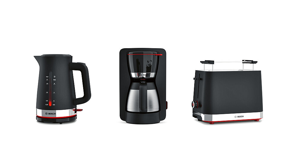 The BOSCH | MyMoment Breakfast Set, consisting of a filter coffee machine, three kettles and two toasters, allows for individual, harmonious combinations of appliances. The elegant design of the entire product family and the interplay of matt and glossy surfaces go hand in hand with the brand’s iconic red colour accents. Intuitive, illuminated controls and energy-saving functions ensure contemporary ease of use.
