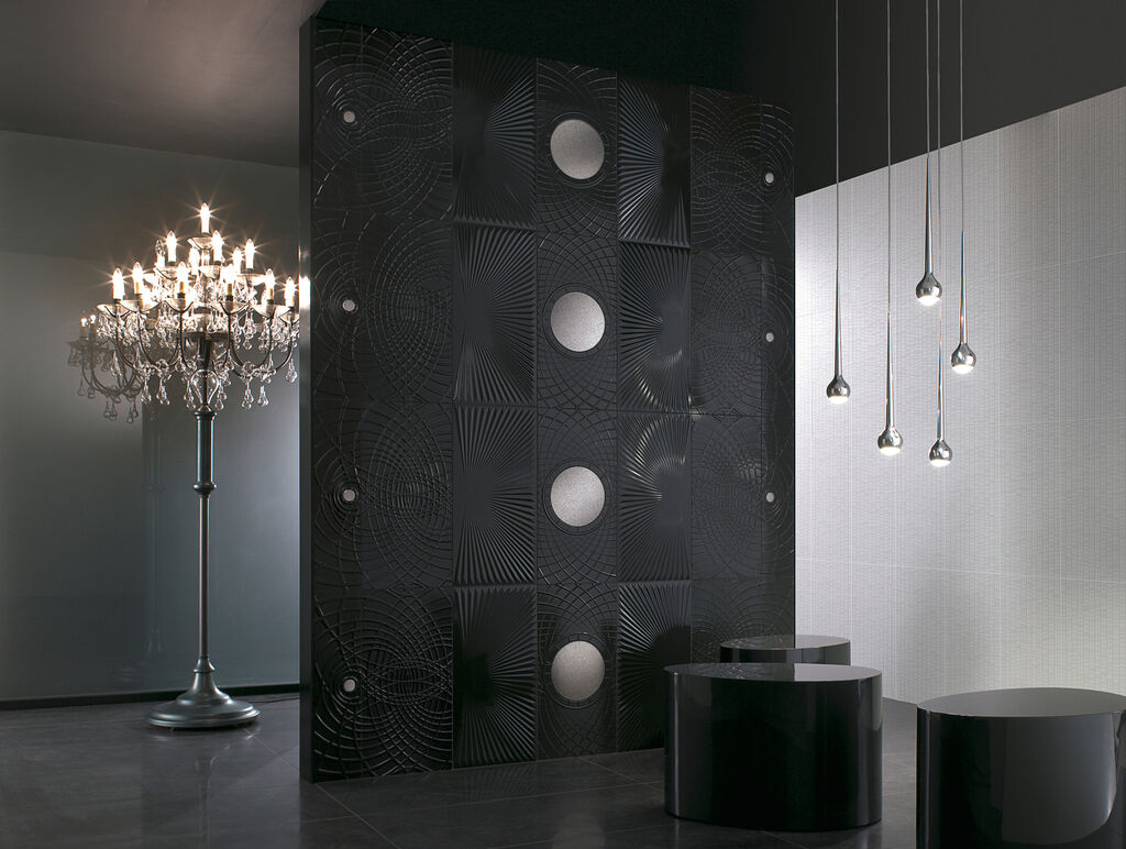The Boudoir collection of wall tiles is based on the concept of using eclectic elements to create the Kristall, Diamant, Corona and Croco Digital décor ranges. The filigree reliefs are formed using an innovative laser process which is inspired by the artisanal craft of crystal-glass cutting. The design goes a step further as the mirrored décor is reminiscent of the bowl of an empty crystal glass.