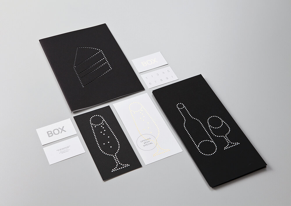 Box Café is part of New Zealand’s largest performing arts centre and functions as an information centre, ticketing office and venue. Inspired by theatre spot lighting, the logo is built from a series of dots, allowing for a variety of different applications:it is printed, die-cut or embossed. Extended into a visual language, the dots also form a series of symbols, which communicate the offering in a pictorial sense. The brand identity includes the signage, the staff uniform, informational materials and an advertising campaign.