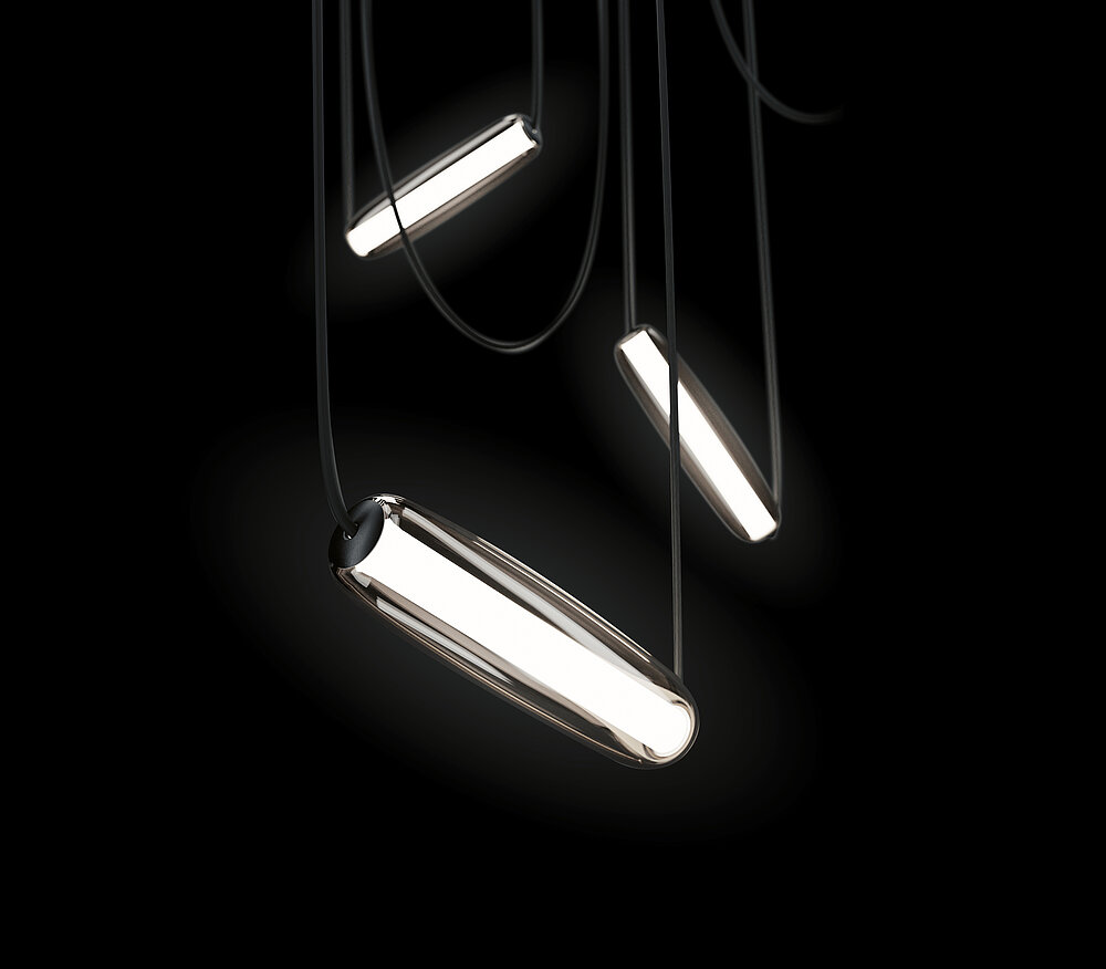 With flexible mounting options, this hanging lamp invites users to create room-defining light installations. Its materiality is equally impressive.