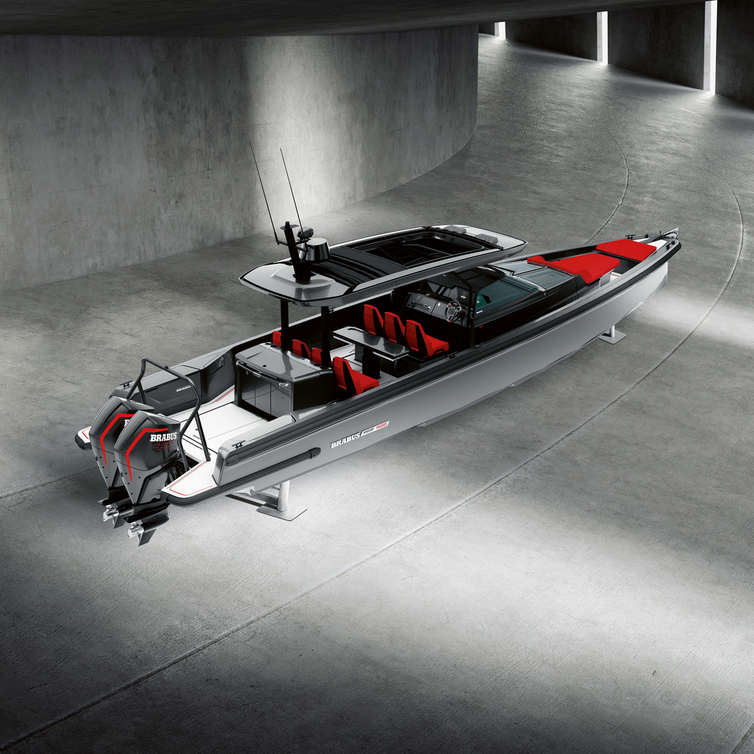The Shadow 900 Sun Top combines an eye-catching, elegant design with technical innovations and high performance. It is built by hand in a limited edition of 37 boats and painted in the colour “Gunmetal Grey”, which in combination with bright red accents in the seating area ensures a high recognition factor. The gullwing doors are a special design feature, transforming the front cabin into a completely open, spacious and functional area. The Shadow 900 is powered by two high-performance engines, each with 450 hp.