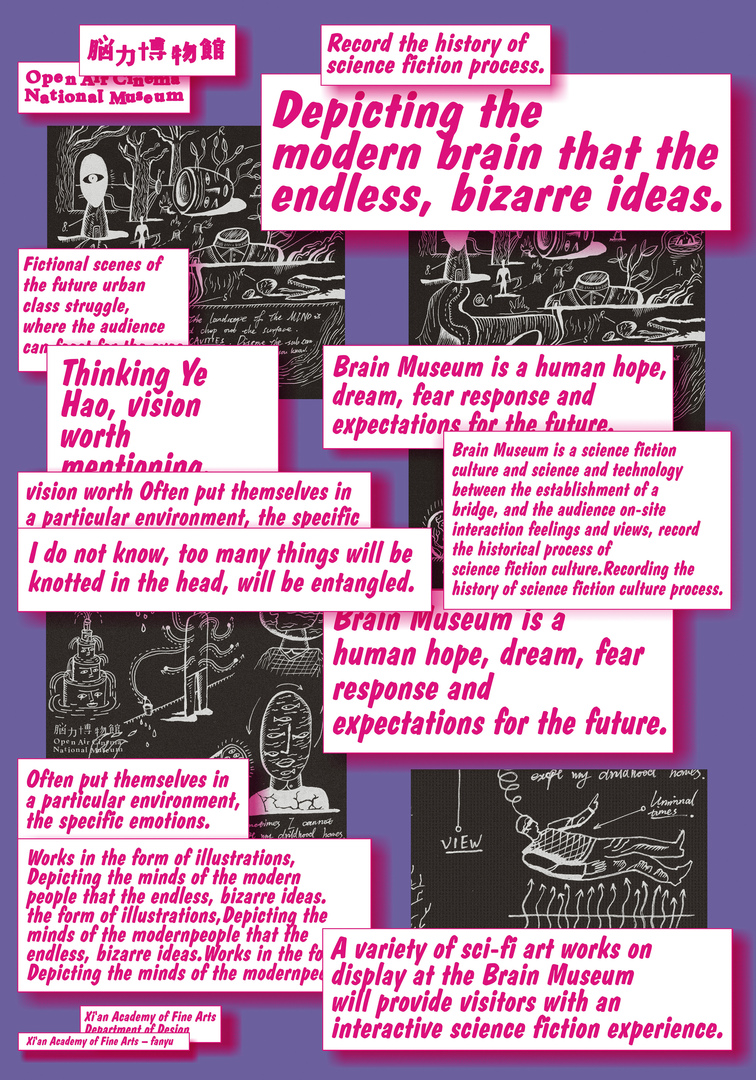 Bizarre ideas, visions and thoughts, which repeat and sometimes go around in circles, are expressed in this posters of the fictitious Brain Art Museum. Black-and-white sketches and text boxes labelled in pink overlay one another and interrupt the flow of reading, thus creating new perspectives. The unusual design arouses the onlooker’s interest on closer inspection and reading, which also gets an initial impression of what this museum is about.