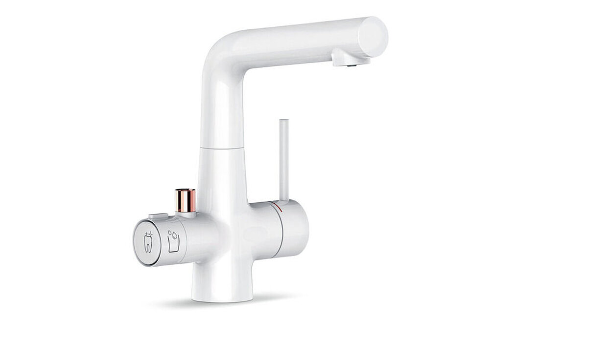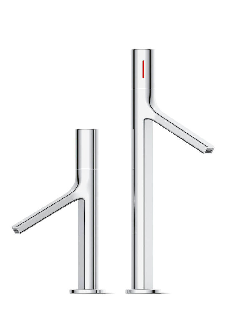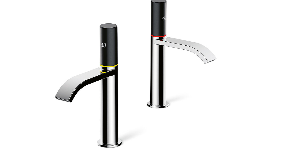 Like a tree branch, the spout of the basin mixer branches off the slender base, tilting downwards. The interplay of flat surfaces and rounded edges is finely tuned. When the tap is opened, the initial water temperature is cold to save energy and hot water. Slight rotational movements regulate both the water flow and the temperature, which is also visualised in a colour display.